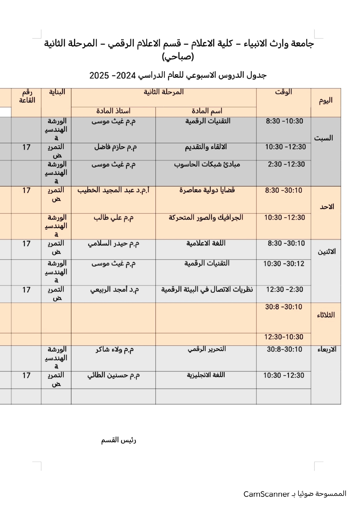 جامعة وارث الانبياء – كلية الاعلام – قسم الاعلام الرقمي – المرحلة الثانية (صباحي)