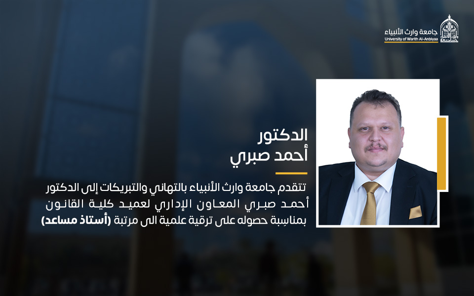 تتقدم رئاسة جامعة وارث الأنبياء (عليه السلام) بالتهنئة إلى الدكتور أحمد صبري، المعاون الإداري لعميد كلية القانون، والدكتور محمد ساجد، رئيس قسم القانون، والدكتور أحمد جابر، أمين مجلس الجامعة، بمناسبة ترقيتهم إلى مرتبة "أستاذ مساعد".