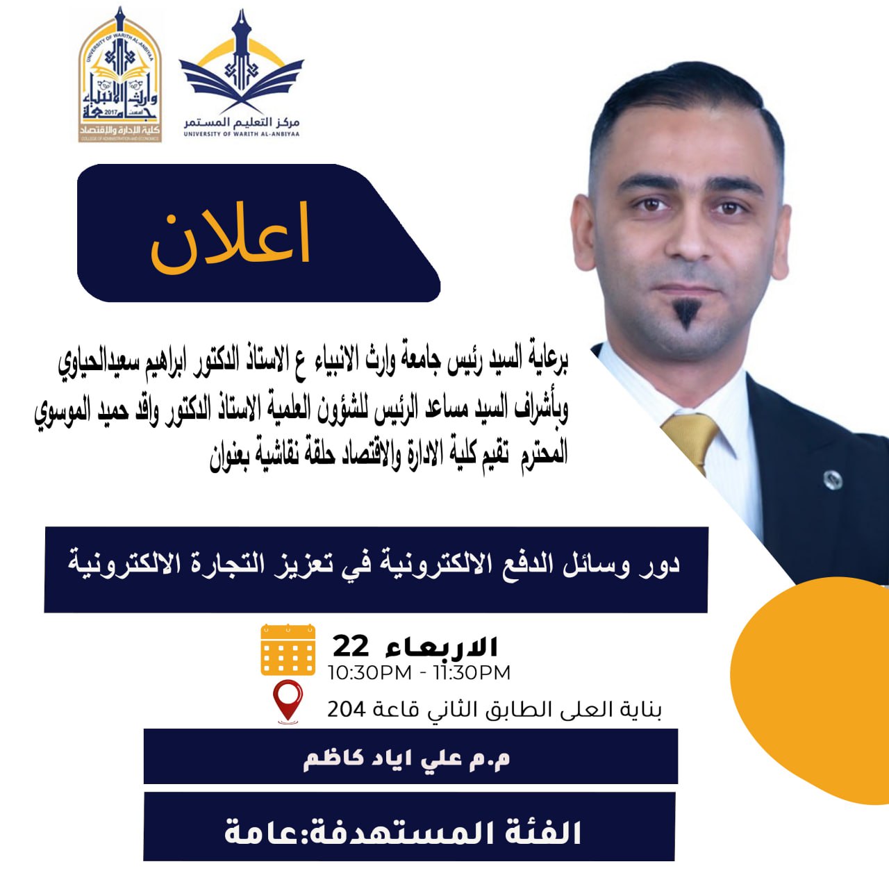 موعدالدورة في يوم الاربعاء المصادف 22\10 في بناية العلى، الطابق الثاني، قاعة 204