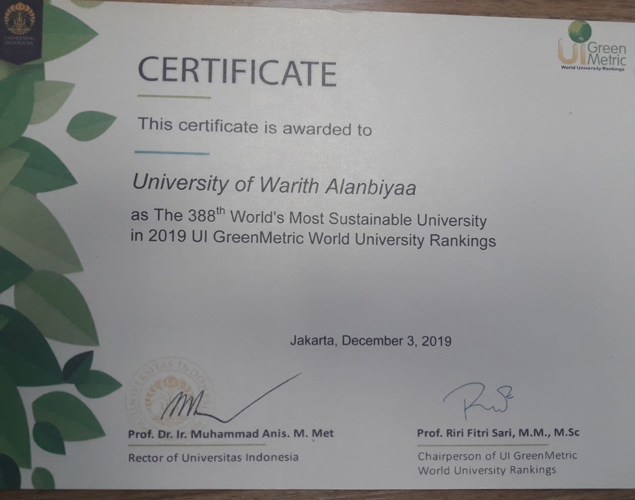 1. دخلت جامعتنا العزيزة بتصنيف UIGreen Metricالعالمي للجامعات و ذلك في سنة 2019 حيث بدأت جامعة اندنوسيا بتصنيف الجامعات العالمية في عام 2010 و المعروفة لاحقا بأسم مقياس الاستدامة للتصنيف العالمي للجامعات و تهدف لقياس الجهود المستدامة للحرم الجامعي.