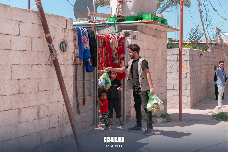 - توزيع المواد الغذائية والكمامات على العوائل المتعففة خلال الحجر الصحي.