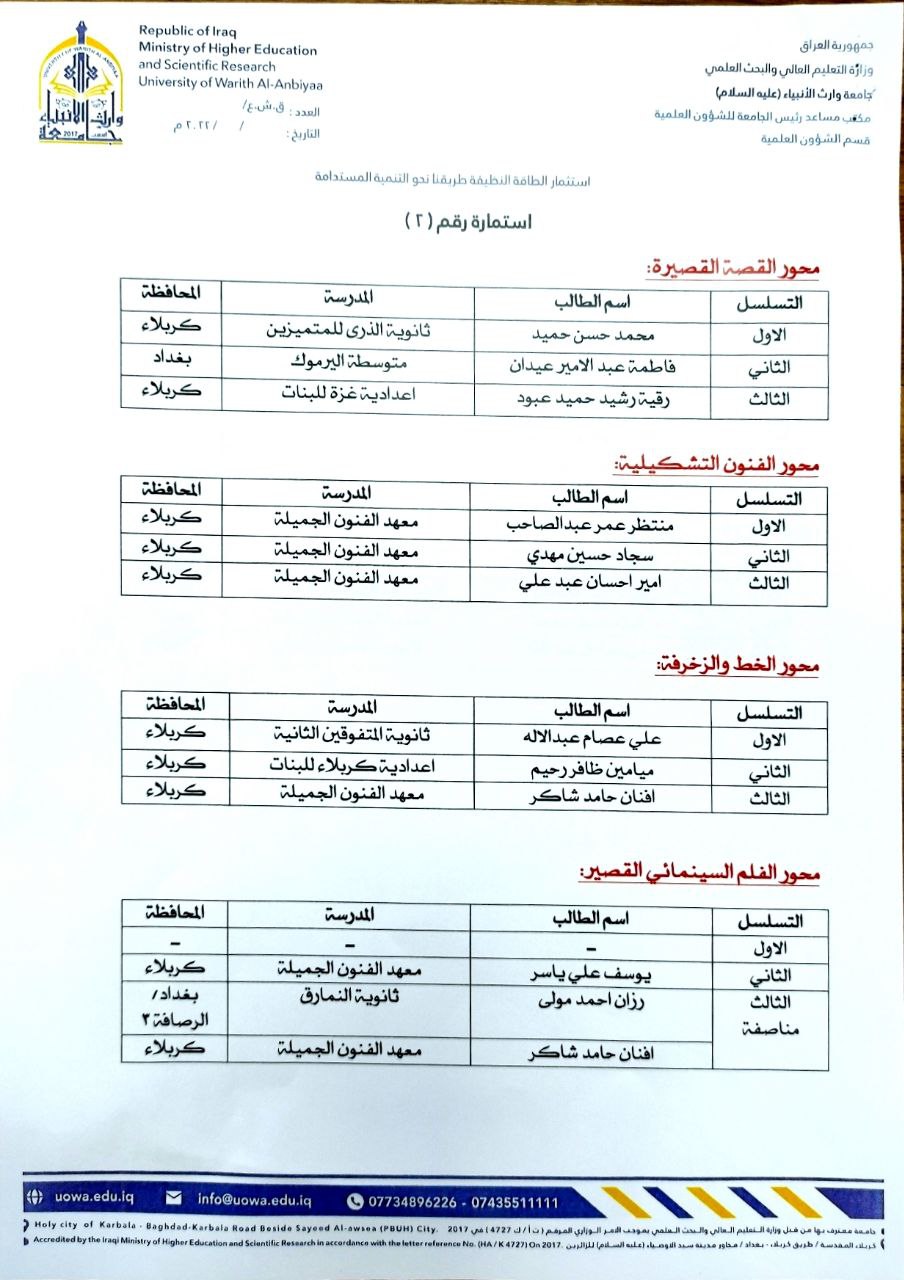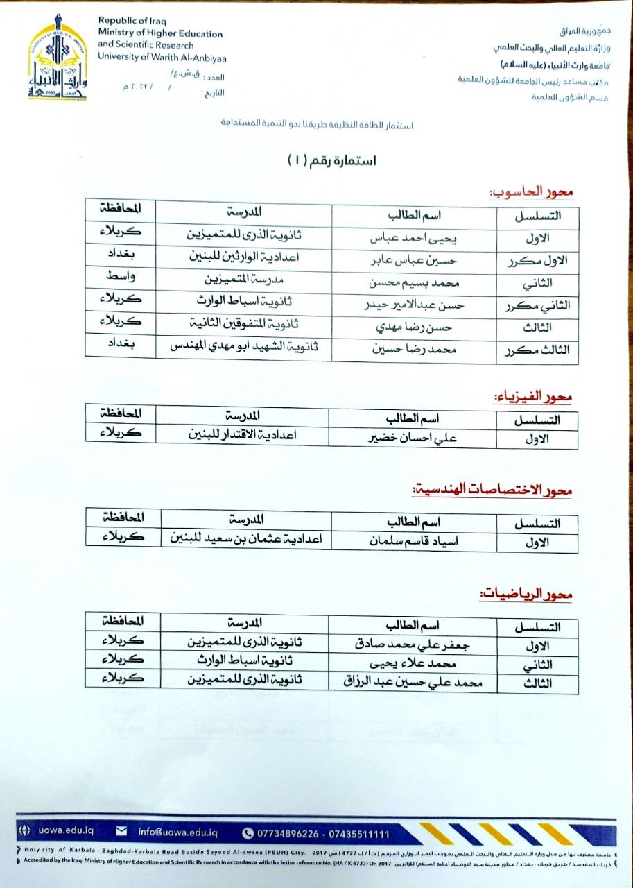 يسر جامعة وارث الانبياء (عليه السلام) أن تعلن عن أسماء الطلبة الفائزين بجائزة وارث الانبياء للمبدعين والموهوبين في المدارس الثانوية.