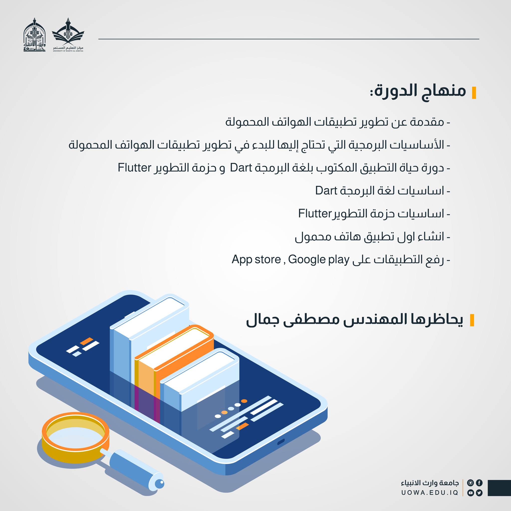 يعلن مركز التعليم المستمر في جامعة وارث الأنبياء (عليه السلام)، بالتعاون مع مركز الحاسبة الالكترونية، عن فتح باب التسجيل في الدورة التدريبية المتميزة بعنوان "حول فكرتك إلى تطبيق واقعي". إذا كنت تحلم بتحويل فكرتك الإبداعية إلى تطبيق حقيقي على الهواتف الذكية، فهذه هي الفرصة المثالية لك
