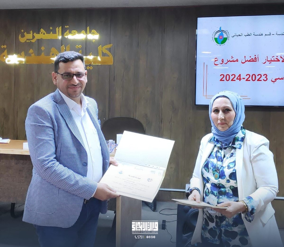 ضمن اعضاء لجنة التحكيم لاختيار افضل مشروع تخرج لطلبة قسم هندسة الطب الحياتي في جامعة النهرين.