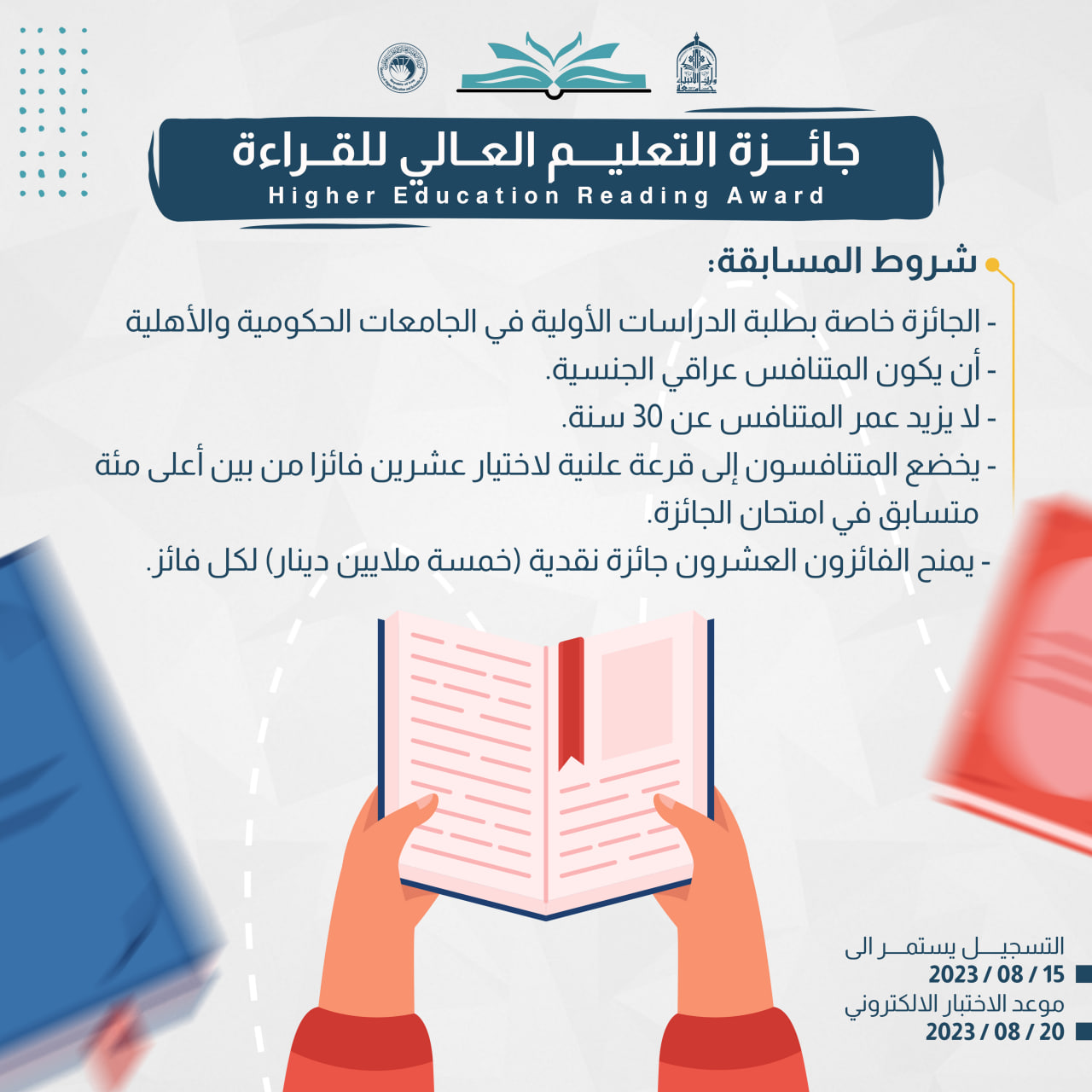 طلقت وزارة التعليم العالي والبحث العلمي مسابقة "جائزة التعليم العالي للقراءة" الخاصة بطلبة الدراسات الأولية في الجامعات العراقية كافة, والتي قيمتها "مئة مليون دينار" تتوزع على عشرين فائزا، وتستند الجائزة الى التنافس على قراءة كتاب (شروط النهضة) للمفكر العربي مالك بن نبي.