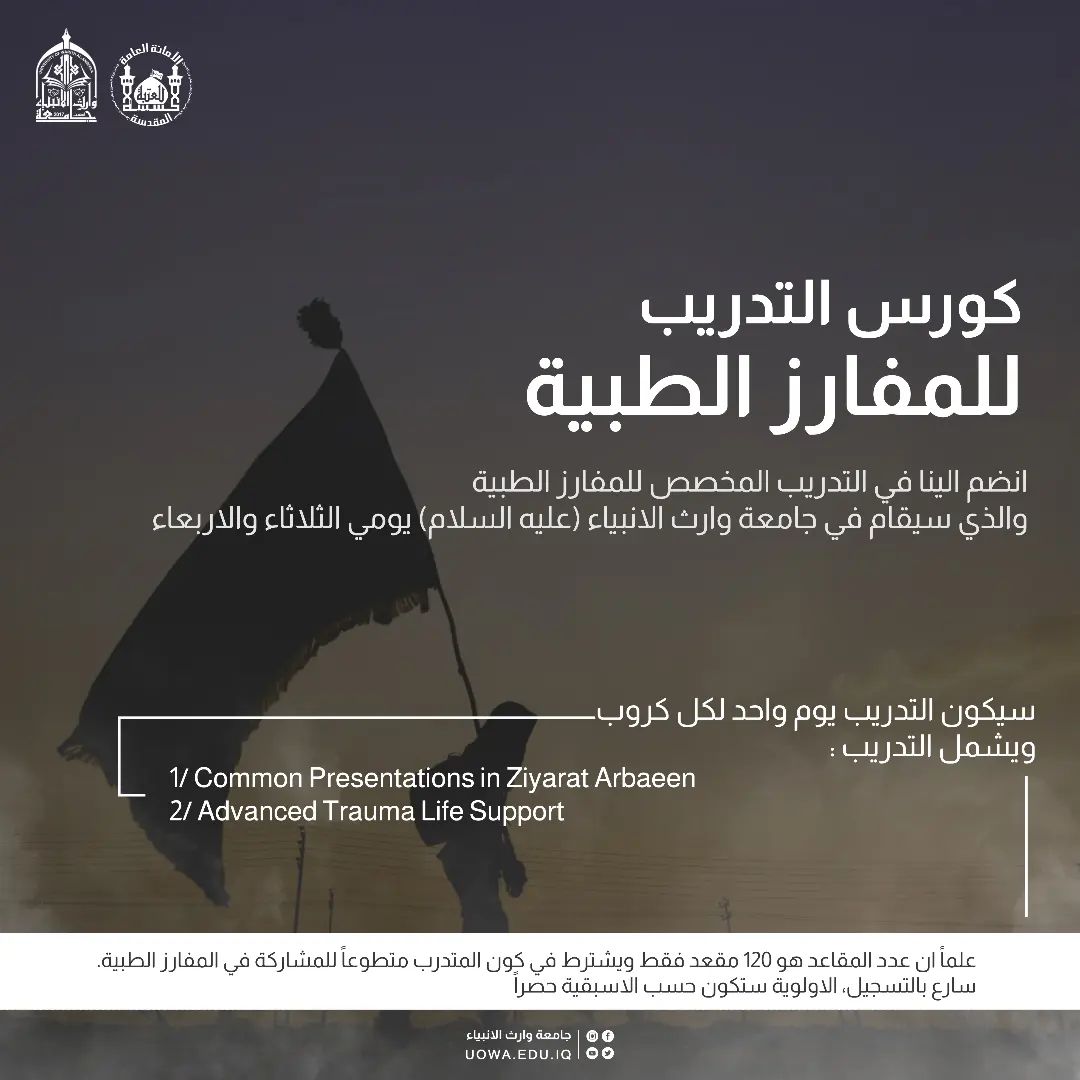 انضم الينا في التدريب المخصص للمفارز الطبية في الزيارة الاربعينية والذي سيقام في جامعة وارث الانبياء (عليه السلام) خلال يومي الثلاثاء والاربعاء 15\16\8\2023