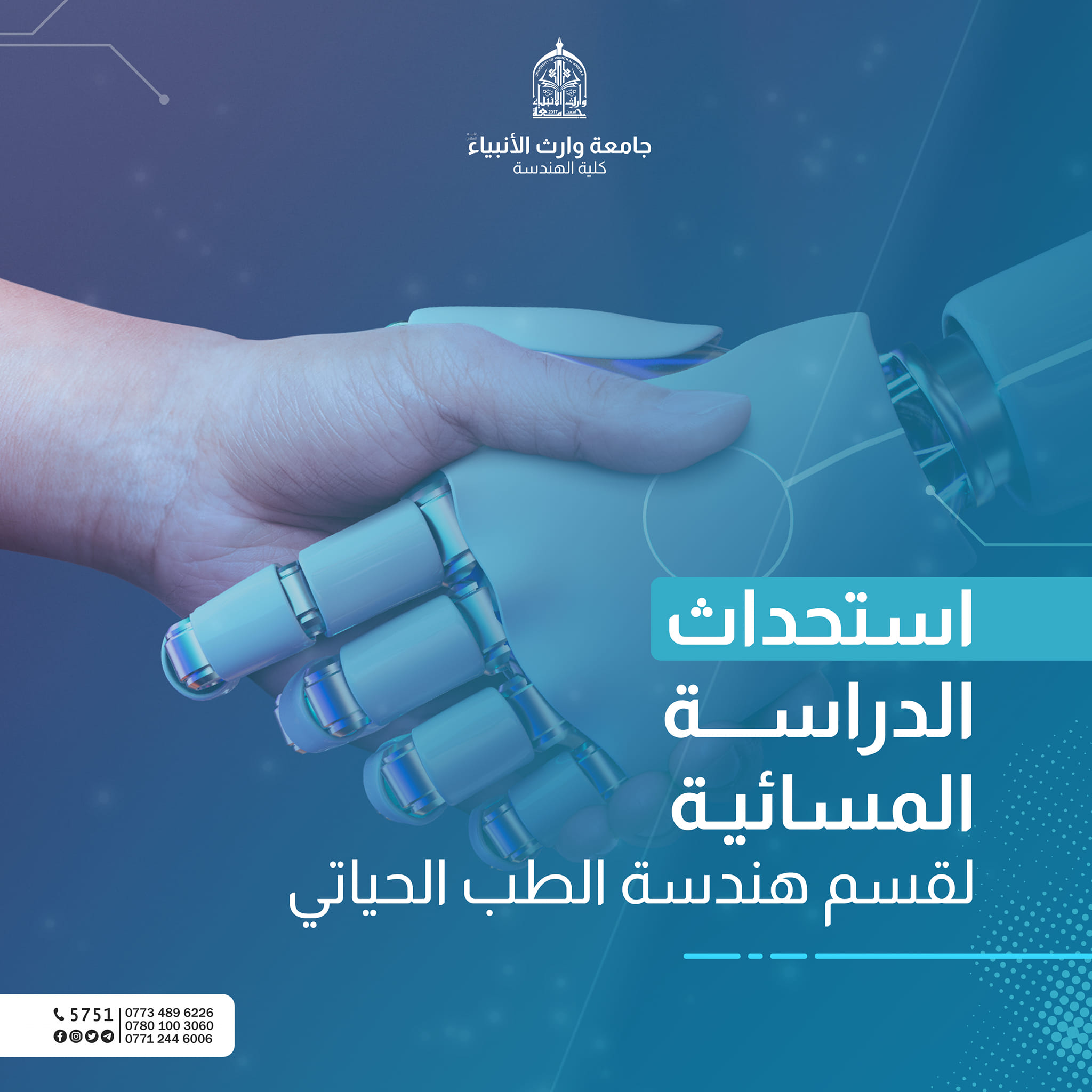 تعلن جامعة وارث الأنبياء (عليه السلام) عن استحداث (الدراسة المسائية) لقسم هندسة الطب الحياتي.