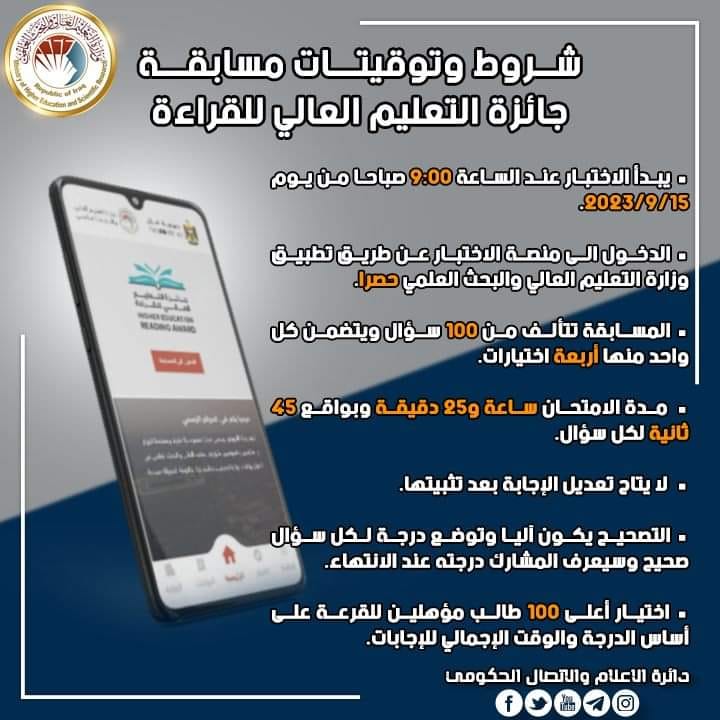 اعزاؤنا الطلبة موعدكم اليوم في تمام 9:00 صباحا مع اختبار جائزة التعليم العالي للقراءة*
