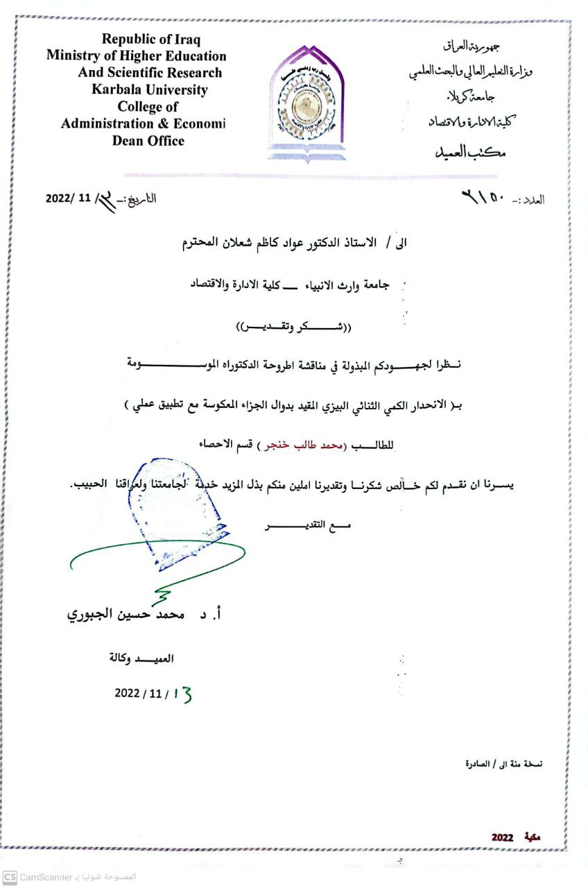 عميد كلية الادارة والاقتصاد جامعة وارث الأنبياء عضوا ومشرفا في لجنة مناقشة