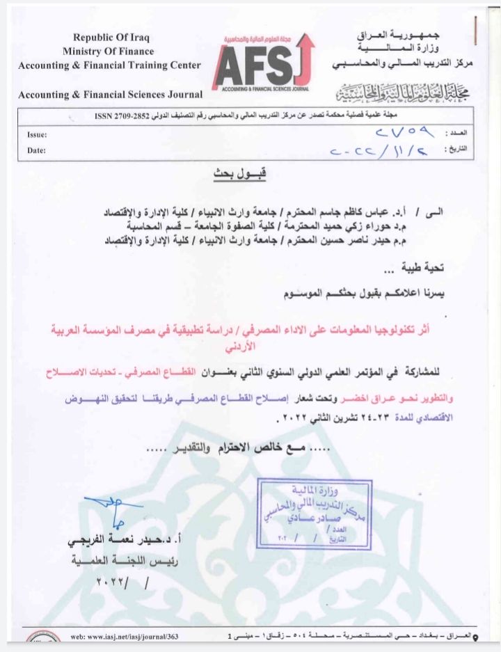 تدريسي في كلية الادارة والاقتصاد / جامعة وارث الانبياء.ع. يشارك في مؤتمر علمي دولي في وزارة المالية العراقية.شارك (م.م حيدر ناصر حسين الميالي) التدريسي في كلية الادارة والاقتصاد/ قسم المحاسبة في المؤتمر العلمي الدولي الثاني بعنوان (القطاع المصرفي تحديات الاصلاح والتطوير نحو عراق اخضر) الذي نظمه مركز التدريب المالي والمحاسبي في وزارة المالية العراقية والبنك المركزي العراقي / بغداد للفترة من  23-24/ 11/ 2022 بالبحث الموسوم (اثر تكنولوجيا المعلومات على الاداء المصرفي – دراسة تطبيقية في مصرف المؤسسة العربية الاردني ) بالاشتراك مع السيد مساعد رئيس الجامعة للشؤون العلمية (ا.د عباس كاظم جاسم الدعمي)، وقد حصل البحث على درجة التميز البحثي لافضل البحوث من بين(100 بحث محلي وعالمي) وهي جائزة مادية مقدمة من وزارة المالية العراقية، اذ تسعى كلية الادارة والاقتصاد الى رفع اسم الجامعة في المحافل والمؤتمرات العالمية بالاضافة الى المساهمة في تقديم البحوث العلمية التي تساهم في تحسين واصلاح الاقتصاد العراقي.