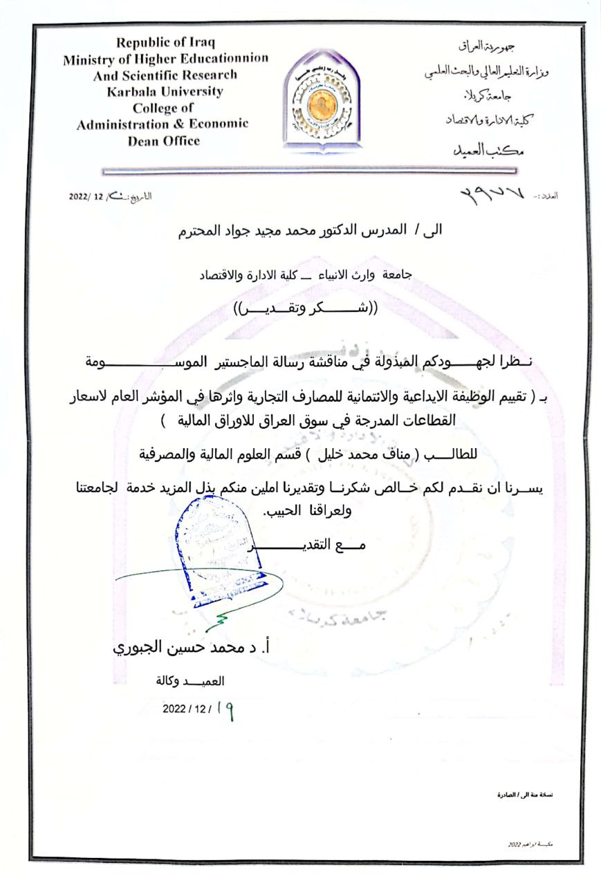 شارك الدكتور محمد مجيد الحمداني في عضويه مناقشة رسالة الماجستير للطالب محمد مناف خليل لرسالته الموسومة ( تقييم الوظيفة الايداعية والائتمانية للمصارف التجارية وأثرها في المؤشرالعام لأسعار القطاعات المدرجة في سوق العراق للأوراق المالية ) وذلك في يوم الثلاثاء المصادف 20/12/2022 في جامعة كربلاء كلية الإدارة والاقتصاد قسم العلوم المالية والمصرفية .اذا تألفت لجنة المناقشة من الاساتذة المدرجة اسمائهم أ.د حيدر يونس الموسوي رئيساأ.م.د حامد محسن جداح عضوا م.د محمد مجيد الحمداني عضواأ.م.د امير علي خليل عضوا ومشرفاوبعد مناقشة مستفيضة تم منح الطالب شهادة الماجستير في علوم المالية والمصرفية ..فكل التوفيق والسداد للباحث والمشرف .