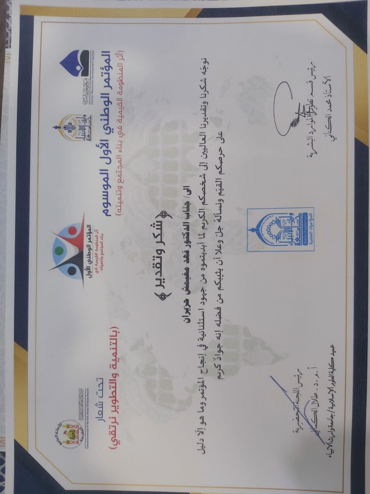 اختيار الاستاذ المساعد الدكتور فهد مغيمش الشمري معاون عميد كلية الإدارة والاقتصاد عضواً في اللجنة العلمية ورئيس الجلسة الخاصة بالمحور الإداري والاقتصادي للمؤتمر الوطني الأول بالتنمية والتطوير نرتقي والموسوم أثر المنظومة القيمية في بناء المجتمع وتنميته الذي أقيم في كلية العلوم الإسلامية جامعة وارث الأنبياء في يوم السبت  المصادف ٢٤ /١٢/ ٢٠٢٢ ومن جانبه قدم عميد الكلية كتاب شكر وتقدير لجهوده المبذولة