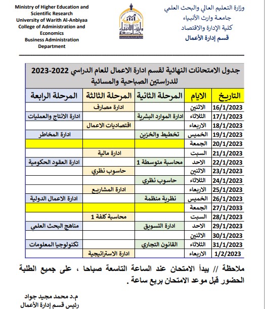 جدول امتحانات نهاية الكورس الاول لقسم ادارة الاعمال للعام الدراسي 2022-2023 للدراستين الصباحية والمسائية مع التعليمات .