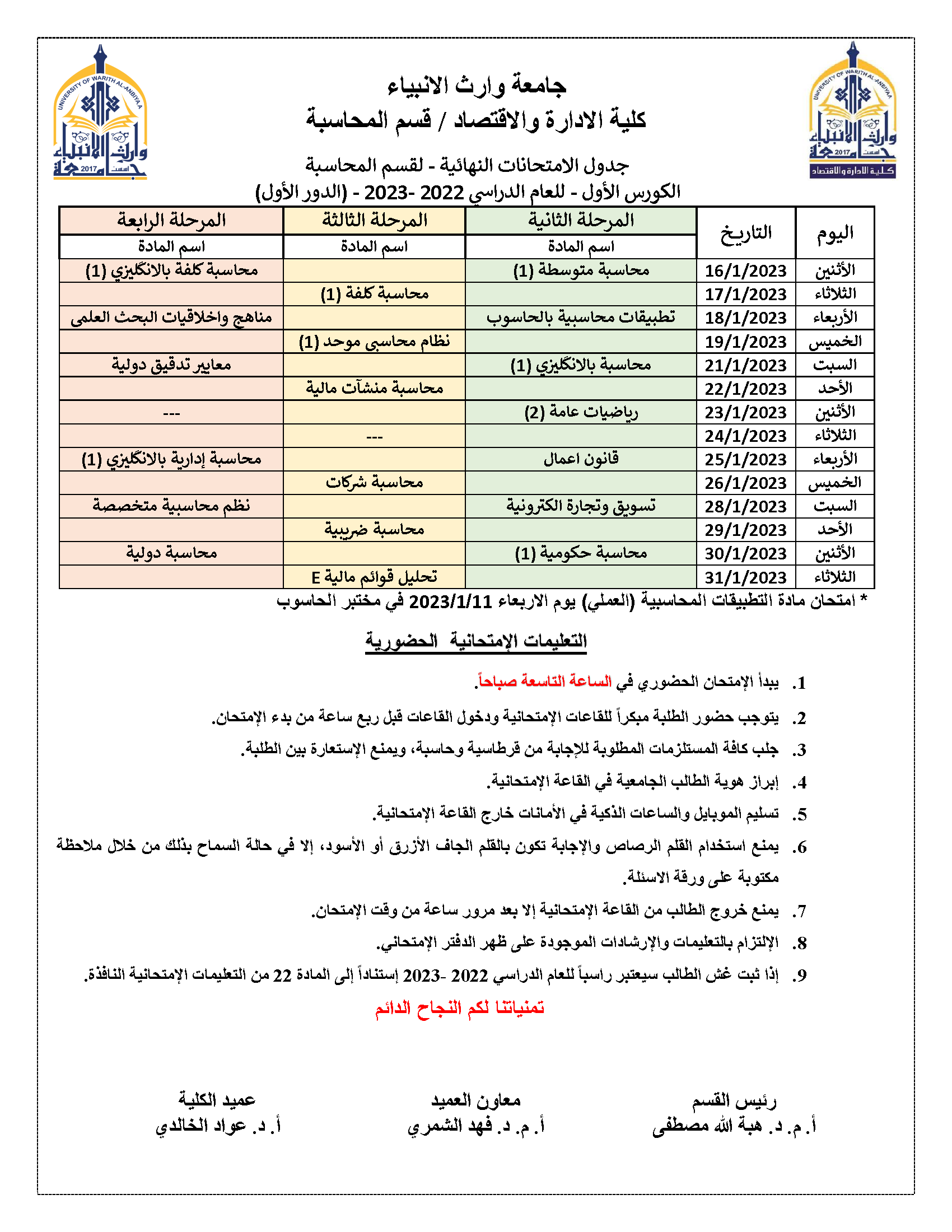 جدول امتحانات نهاية الكورس الاول لقسم المحاسبة للعام الدراسي 2022-2023 للدراستين الصباحية والمسائية مع التعليمات الامتحانية .