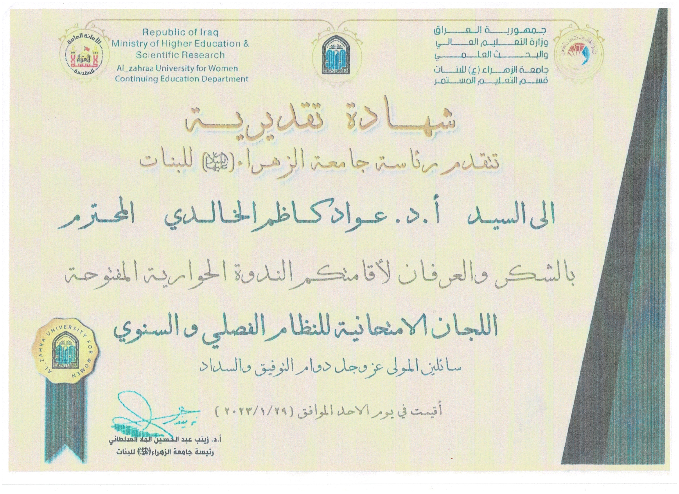 انتهت الورشة بتقديم شهادة تقديرية من قبل رئيسة جامعة الزهراء سلمها نيابة الدكتور زهير جدوع نائب رئيس الجامعة .