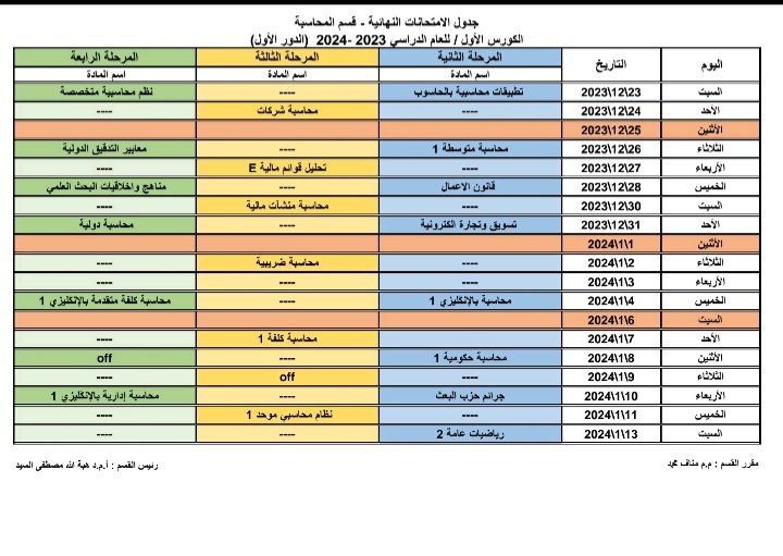 جدول الامتحانات النهائية لقسم المحاسبة الكورس الاول 2022-2023