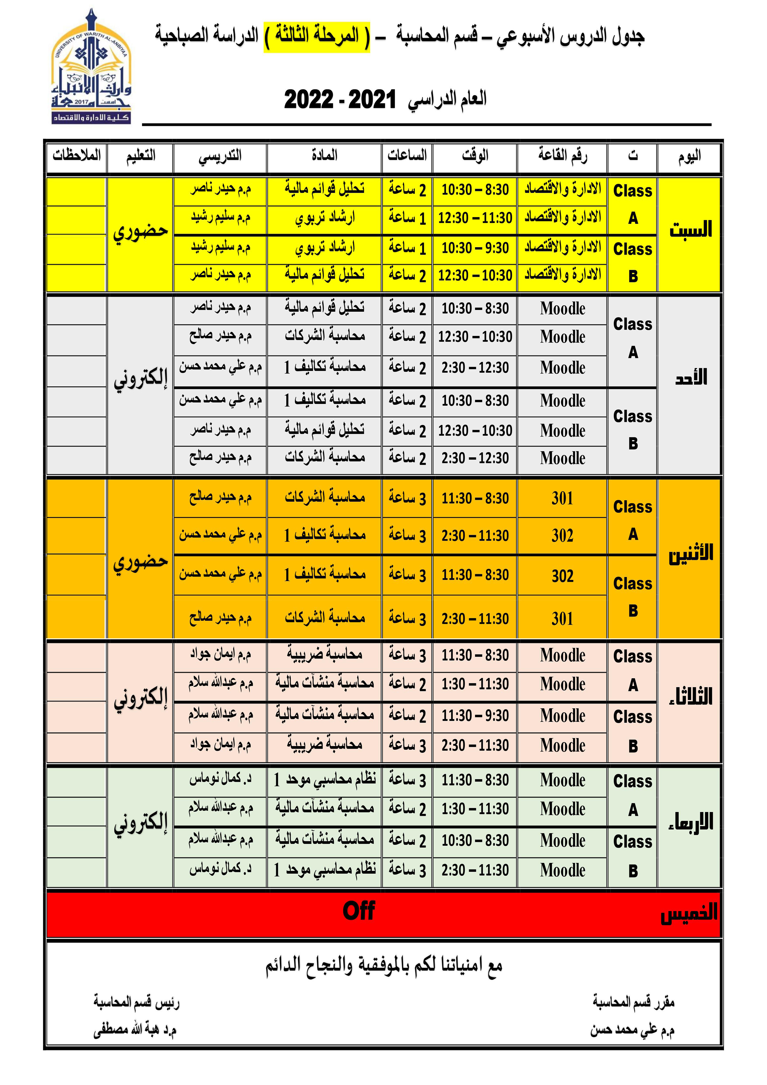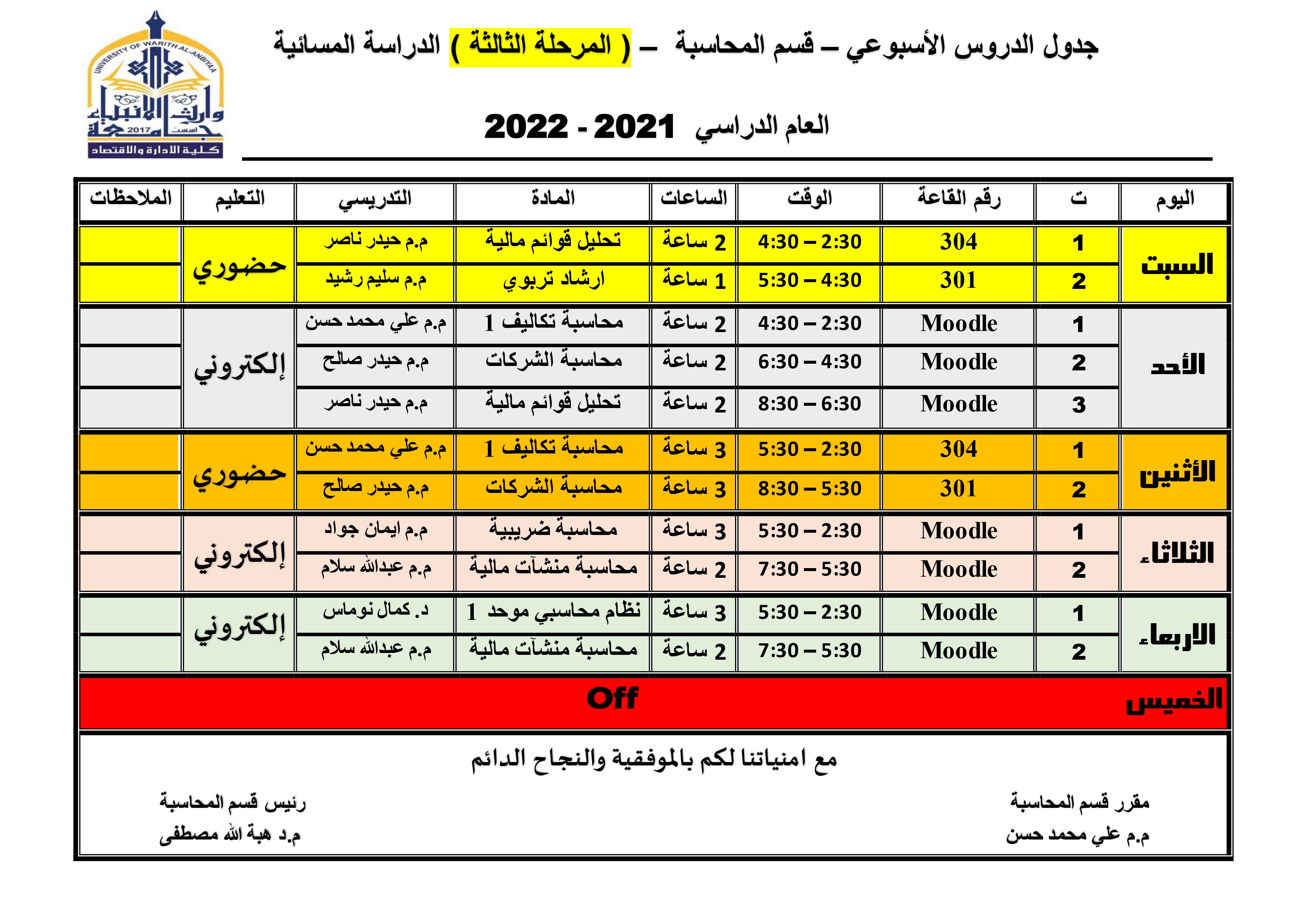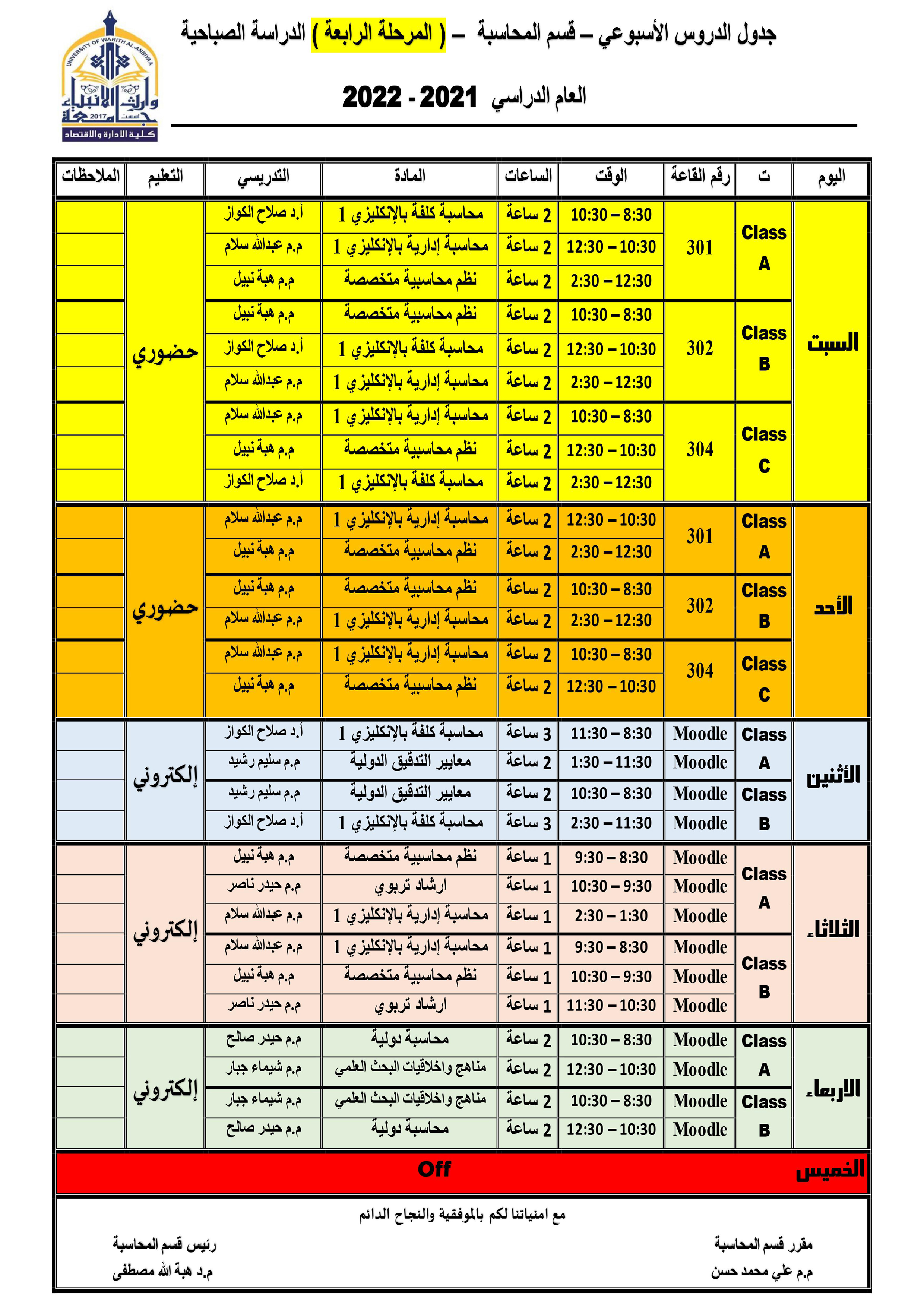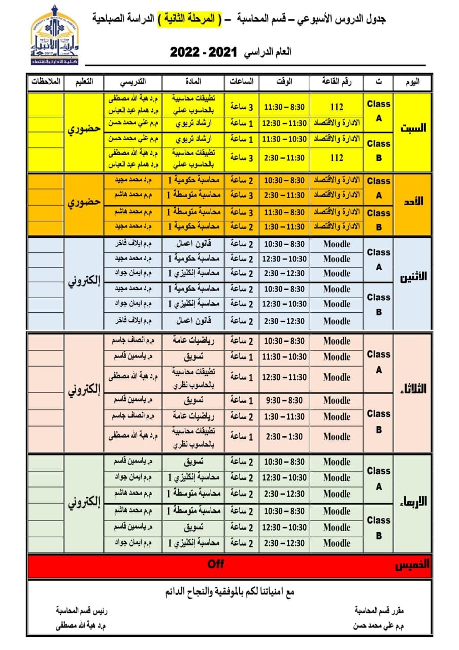 جدول الدروس الاسبوعي لقسم المحاسبة للفصل الاول من العام الدراسي 2021/2022