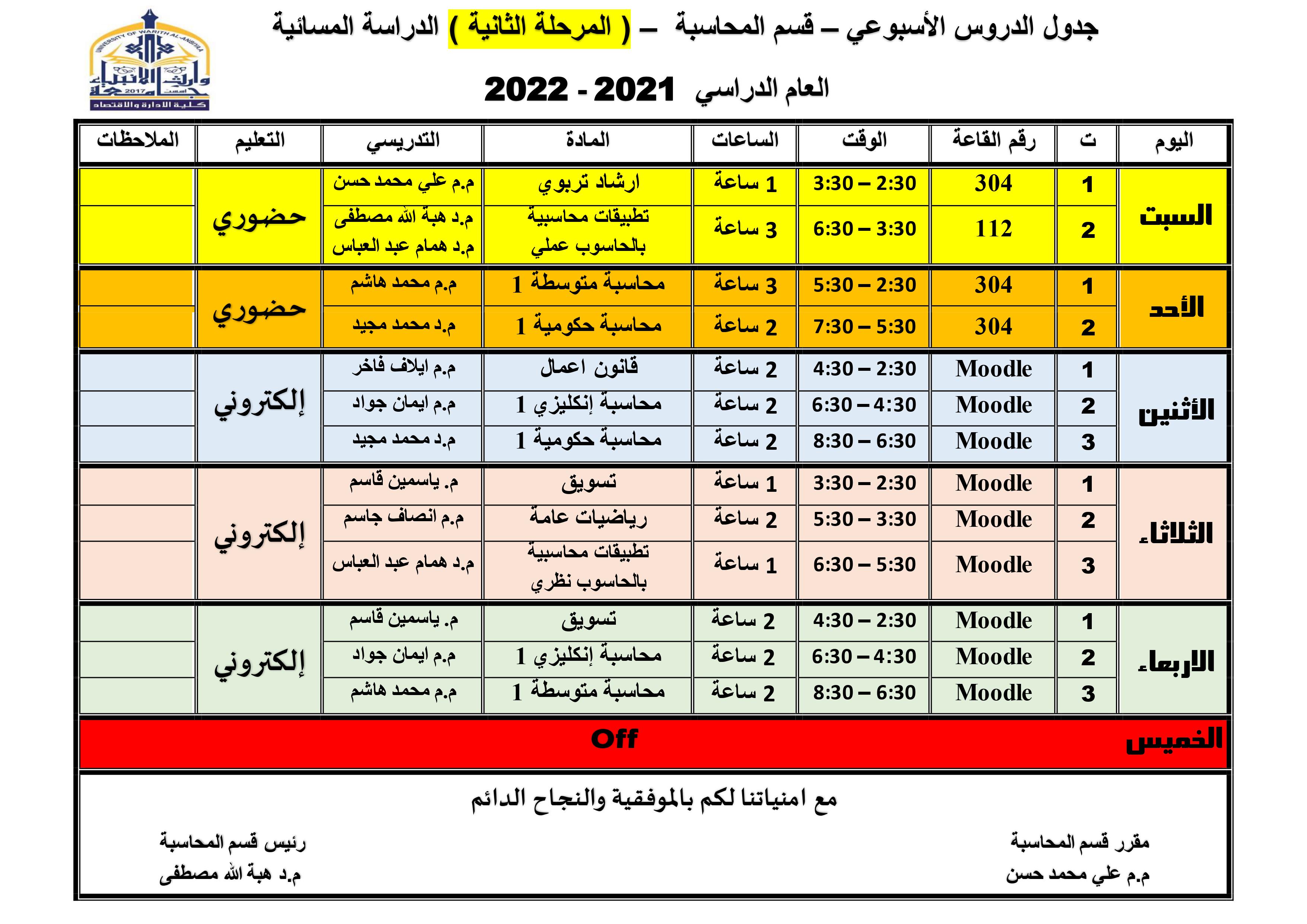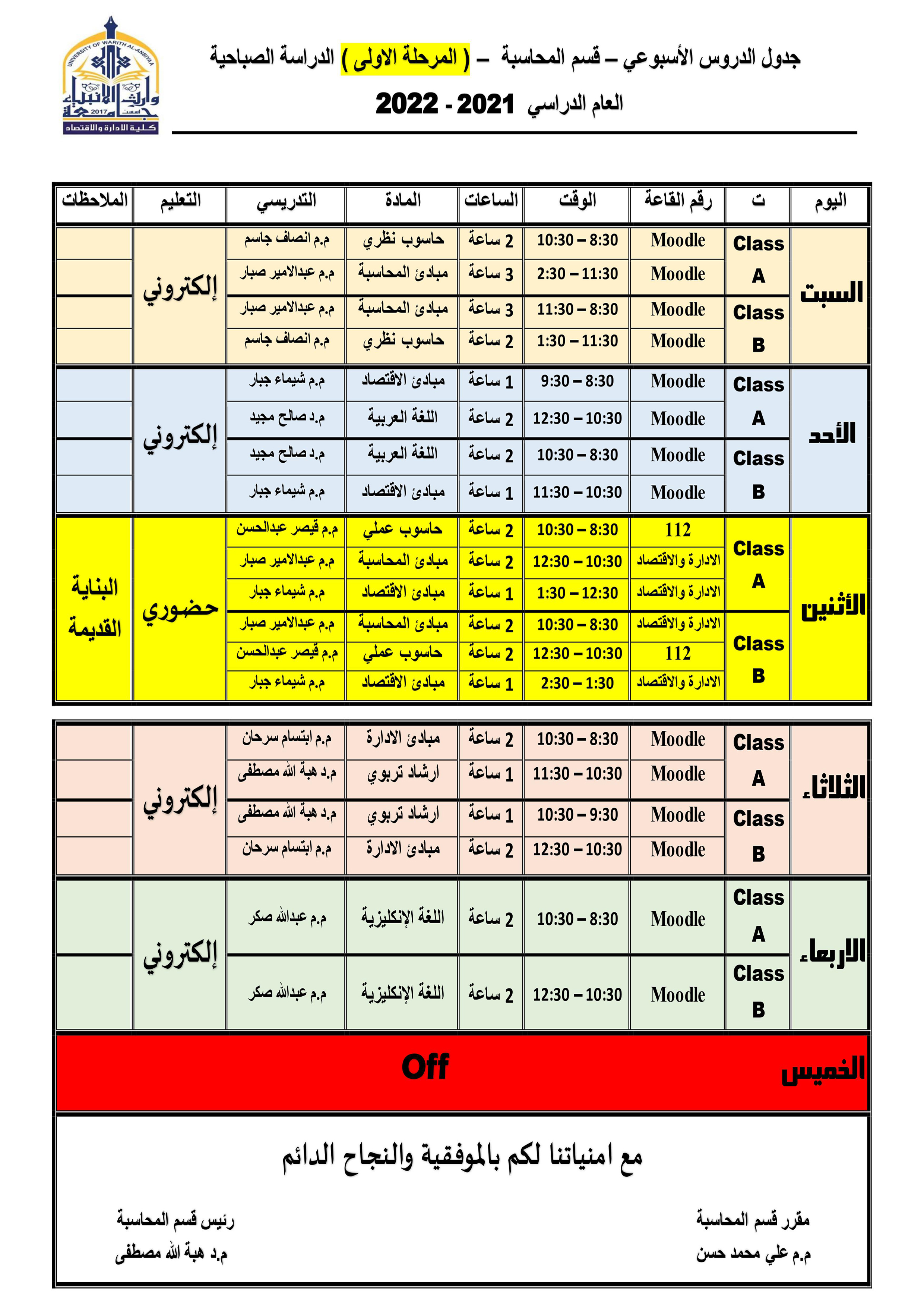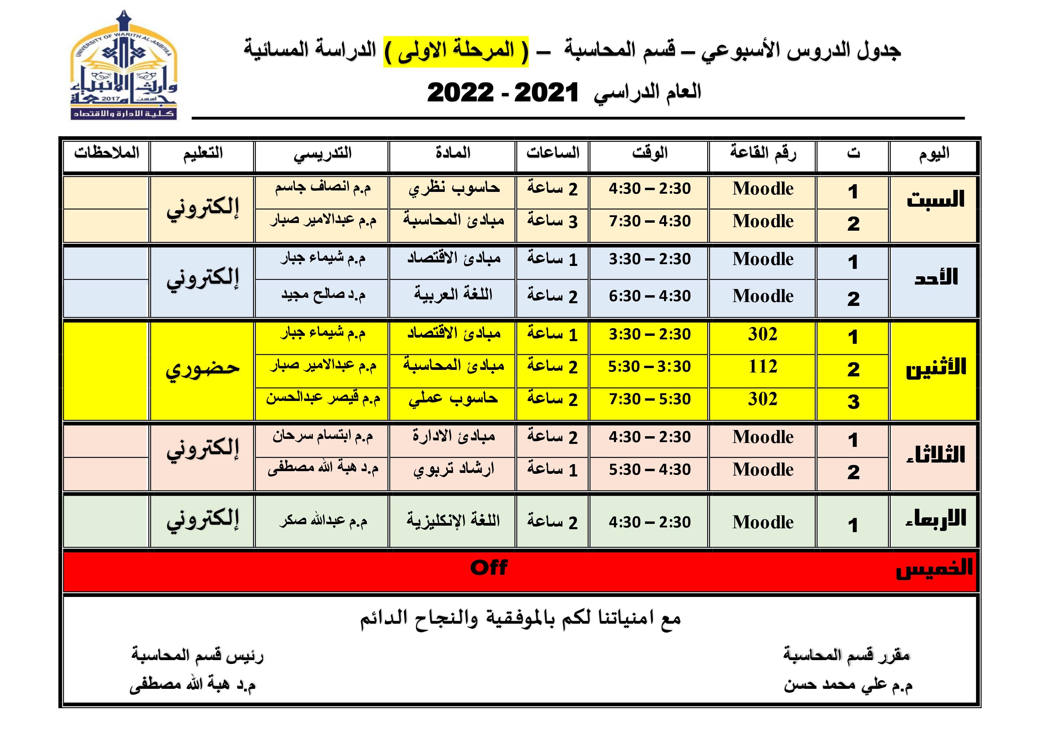 جدول الدروس الاسبوعي لقسم المحاسبة للفصل الاول من العام الدراسي 2021/2022