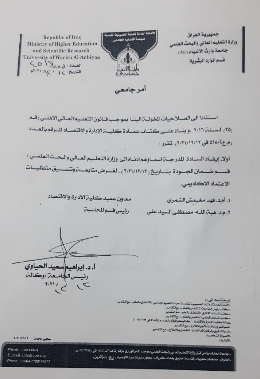 ١. قدمت كلية الادارة والاقتصاد متمثلة في معاونها ورئيس قسم المحاسبة كتيب الدليل الخاص بالواجبات والصلاحيات المعد من قبل الكليه هدية الى مدير قسم الاعتماد.