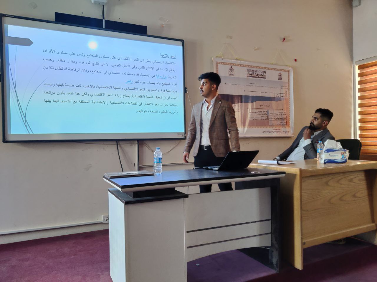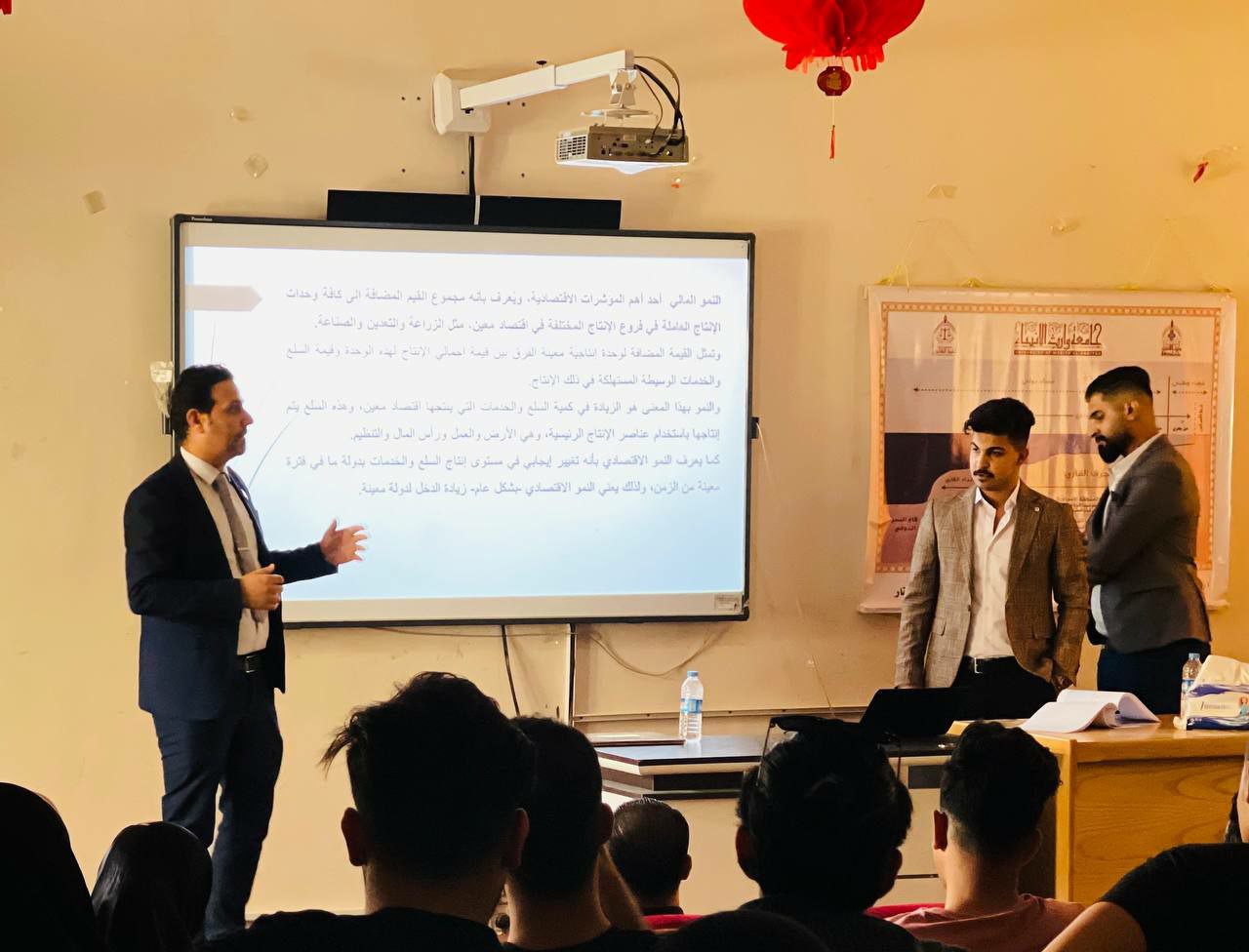 ضمن النشاطات الطلابية العلمية في كلية الادارة والاقتصاد قدم كل من الطالب امير هاني مزبان والطالب زيد فيصل حسين من طلبة المرحلة الاولى ندوة علمية بعنوان ( النمو المالي واثرة في الاقتصاد العام ) باشراف رئيس القسم م.د محمد مجيد الحمداني .