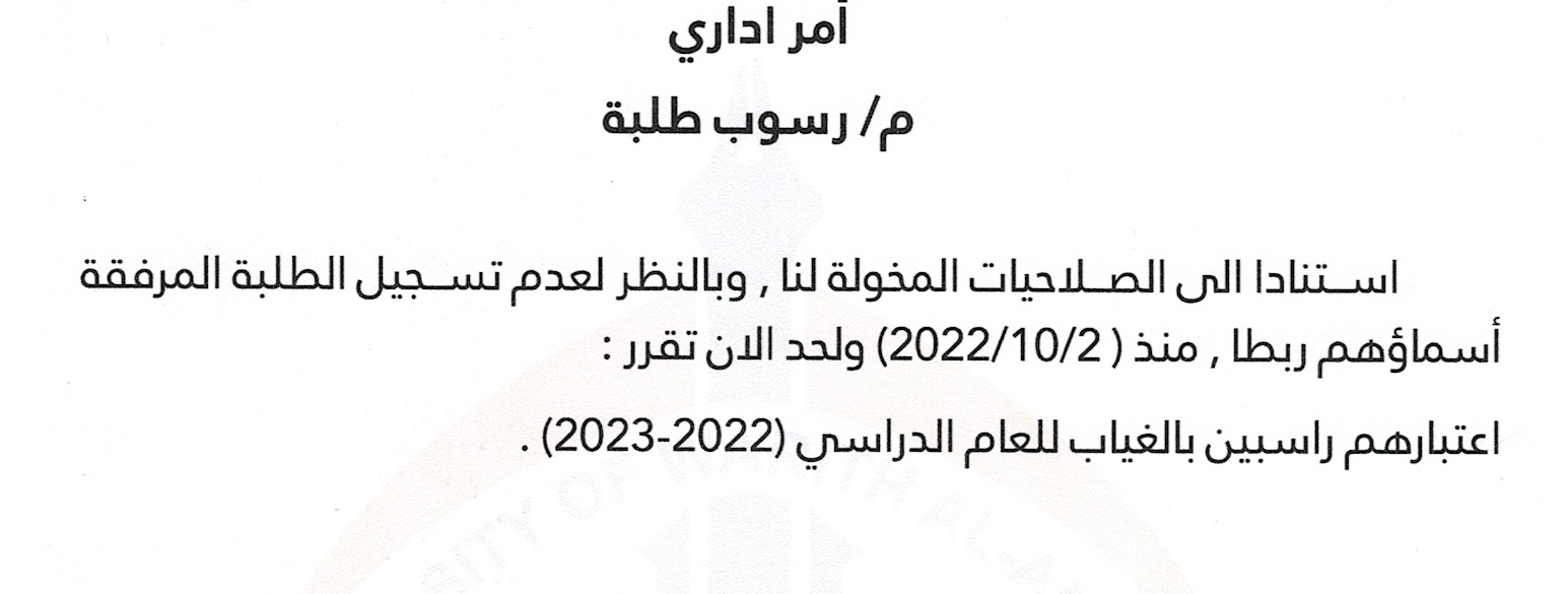 بالنظر لعدم تسجيل الطلبة المذكورة اسمائهم في القوائم المنشورة اعلاه، منذ (2/10/2022) ولغاية الان.