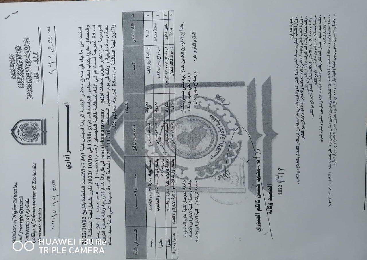 شارك الاستاذ الدكتور عواد كاظم الخالدي في عضويه ومناقشة رسالة الماجستير للطالبة (نور عامر حرب) لرسالته الموسومة (التقدير البيزي consul Kumaras في ضل دالة خسارة تربيعية ودالة خسارة انتروبي عامة دراسة تطبيقية) وذلك في يوم الخميس المصادف 10/11/2022، في جامعة كربلاء كلية الإدارة والاقتصاد قسم الاحصاء.