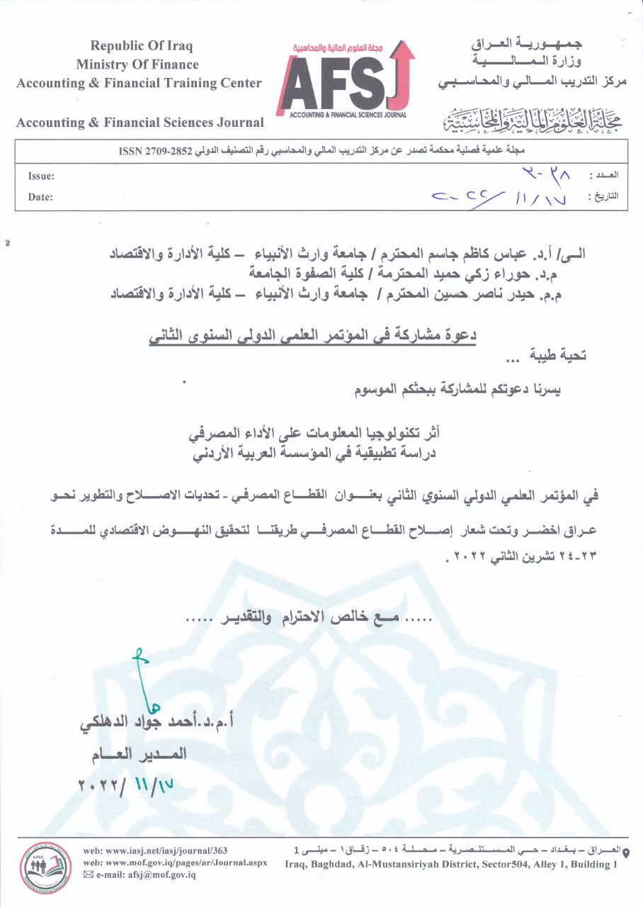 شارك (م.م حيدر ناصر حسين الميالي) التدريسي في كلية الادارة والاقتصاد/ قسم المحاسبة في المؤتمر العلمي الدولي الثاني بعنوان (القطاع المصرفي تحديات الاصلاح والتطوير نحو عراق اخضر) الذي نظمه مركز التدريب المالي والمحاسبي في وزارة المالية العراقية والبنك المركزي العراقي / بغداد للفترة من  23-24/ 11/ 2022 بالبحث الموسوم (اثر تكنولوجيا المعلومات على الاداء المصرفي – دراسة تطبيقية في مصرف المؤسسة العربية الاردني ) بالاشتراك مع السيد مساعد رئيس الجامعة للشؤون العلمية (ا.د عباس كاظم جاسم الدعمي)، وقد حصل البحث على درجة التميز البحثي لافضل البحوث من بين(100 بحث محلي وعالمي) وهي جائزة مادية مقدمة من وزارة المالية العراقية، اذ تسعى كلية الادارة والاقتصاد الى رفع اسم الجامعة في المحافل والمؤتمرات العالمية بالاضافة الى المساهمة في تقديم البحوث العلمية التي تساهم في تحسين واصلاح الاقتصاد العراقي.