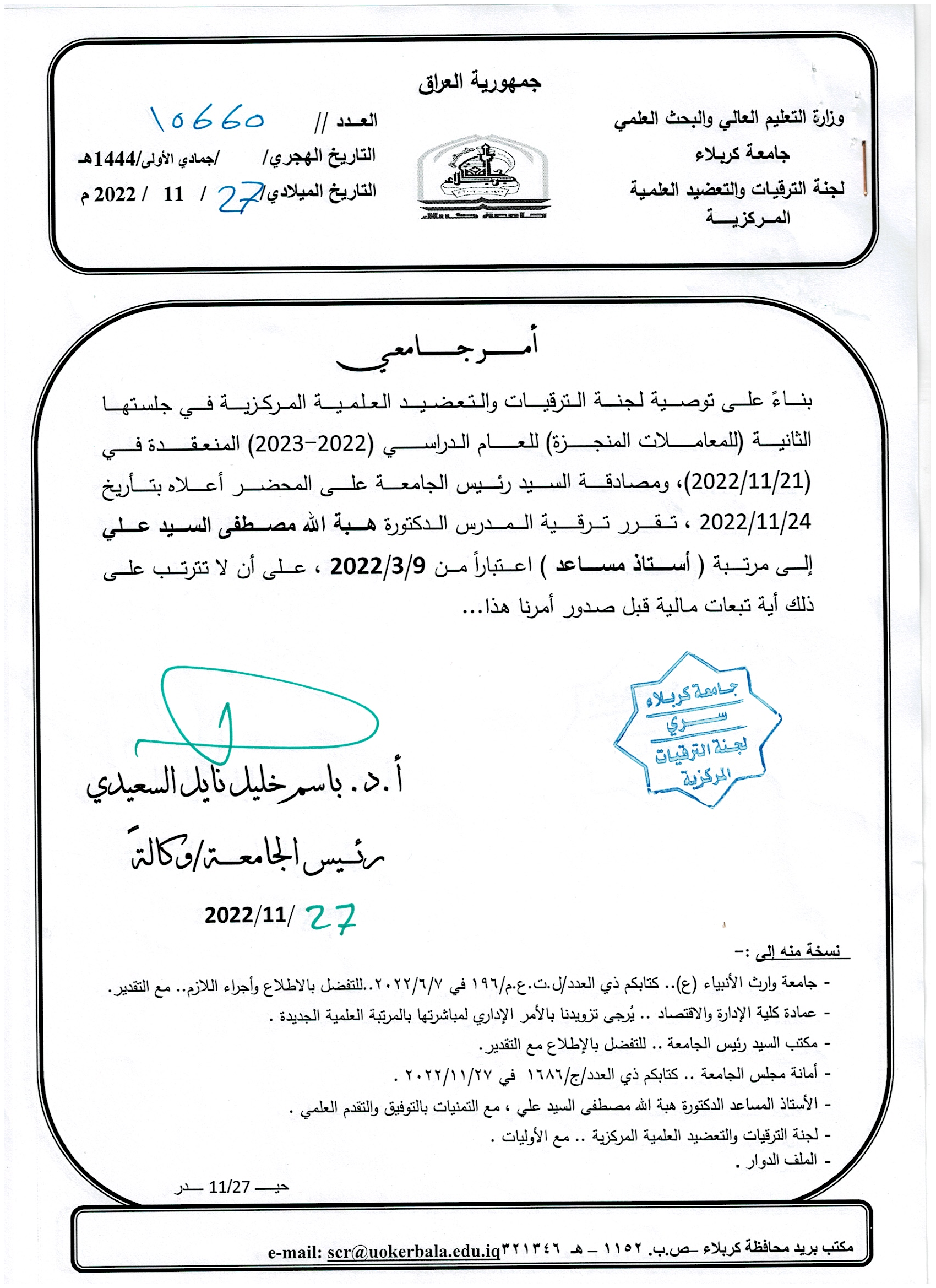 يسر عمادة كلية الادارة والاقتصاد ان تتقدم الى السيدة رئيس قسم المحاسبة (أ. م. د هبة الله مصطفى السيد) بأزكى التبريكات بمناسبة ترقيتها الى مرتبة استاذ مساعد، نسأل الله ان يمدها بالمزيد من التقدم والتوفيق والله ولي التوفيق
