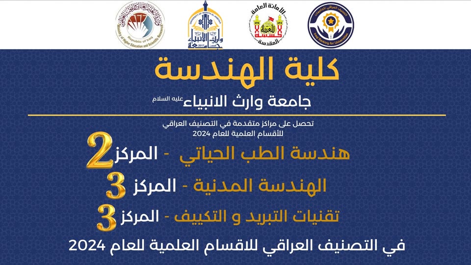 حققت أقسام كلية الهندسة في جامعة وارث الأنبياء (عليه السلام) إنجازاً متميزاً في التصنيف العراقي للجامعات والكليات الأهلية الذي أعلنت عنه وزارة التعليم العالي والبحث العلمي.