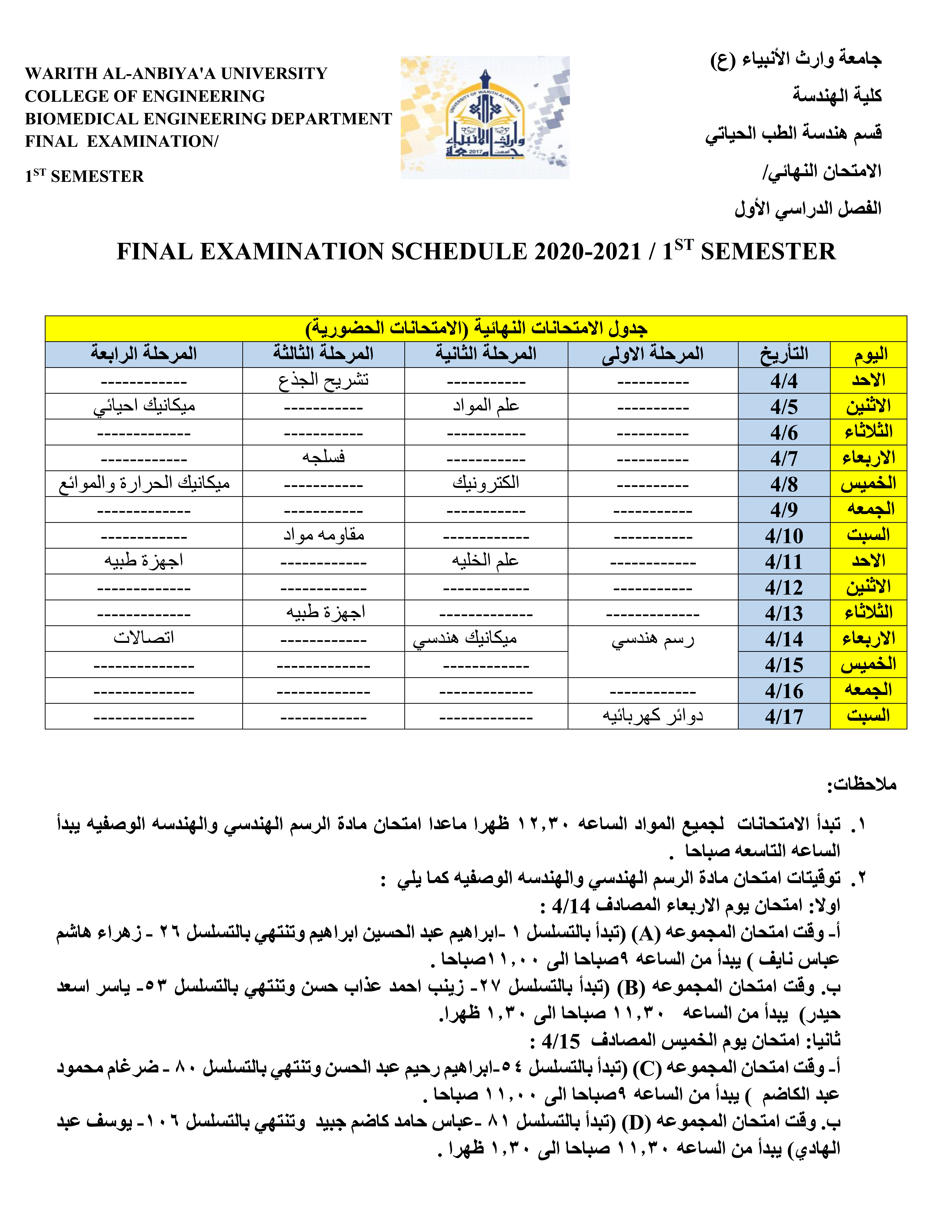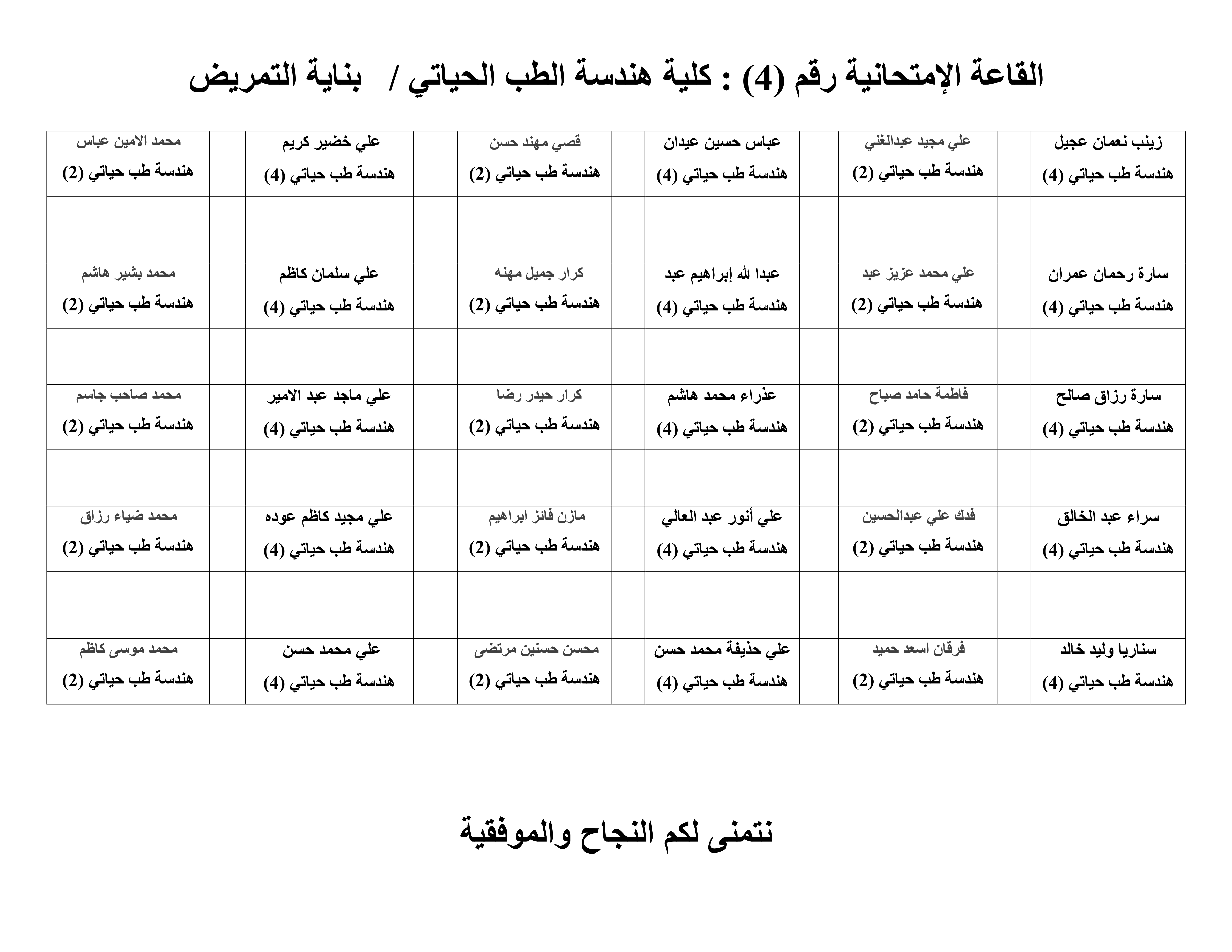 أدناه قوائم الأسماء الخاصة بالطلبة المشمولين بالامتحانات الحضورية لقسم هندسة الطب الحياتي.
