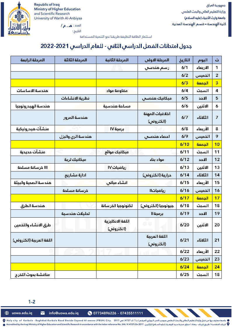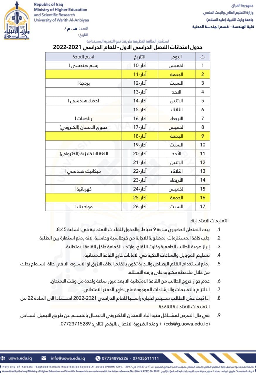 جدول الامتحانات النهائية للدور الثاني لكلا الفصلين للعام الدراسي 2021/2022 مع التعليمات الخاصة باجراء الامتحانات