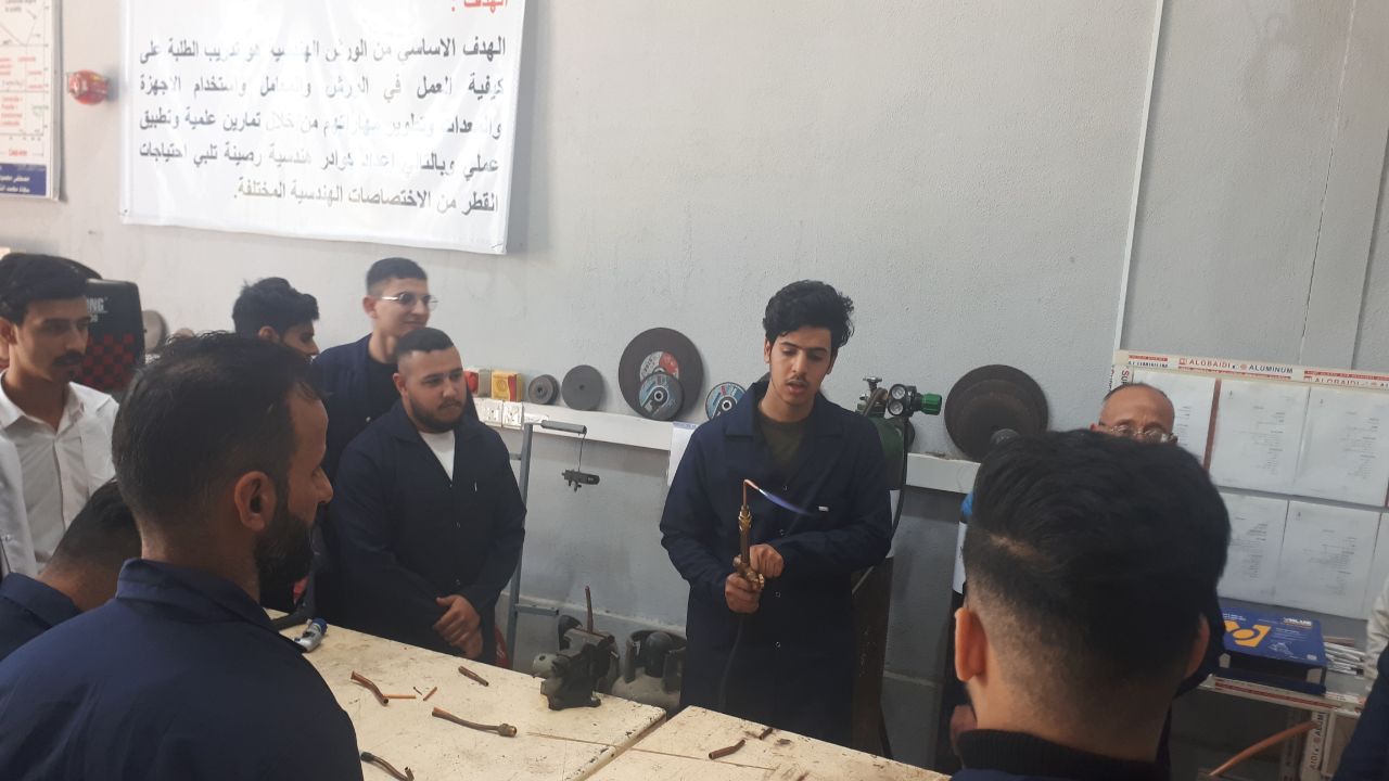جانب من المحاضرات العملية لورشة اللحام لطلبة قسم هندسة تقنيات التكييف والتبريد حيث تدرب الطلبة على أجراء اللحام الغازي باستخدام غازي الاوكسي استلين والمستخدم في التطبيقات الصناعية لمجال التكييف والتبريد.