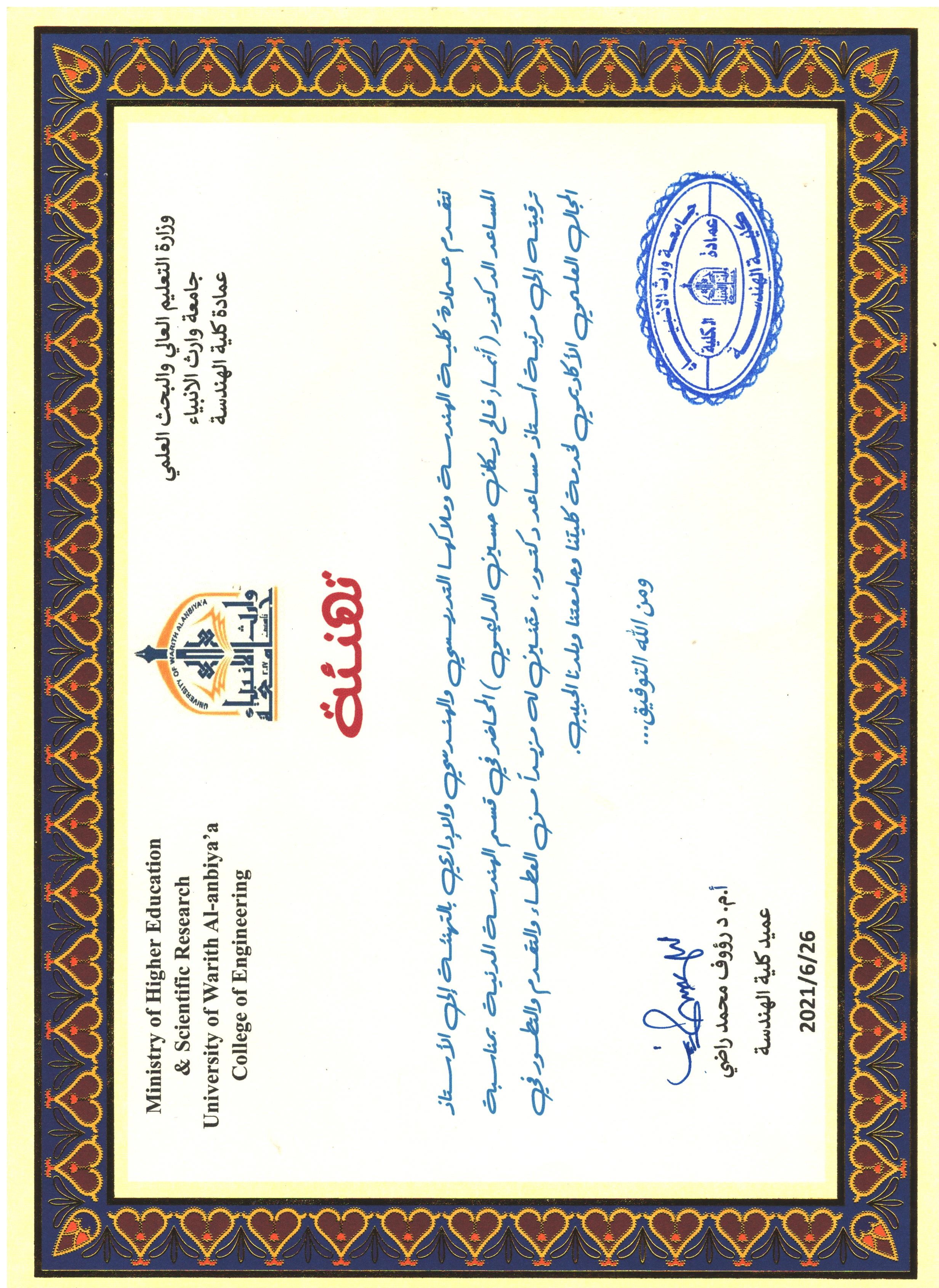 تتقدم كُلْيَة الهندسة و ملاكها التدريسي و الهندسي و الإداري بالتهنئة إلى الأستاذ المساعد الدكتور (أنمار فالح ديكان) التدريسي - في قسم الهندسة المدنية بمناسبة ترقيته إلى مرتبة أستاذ مساعد دكتور، متمنين له مزيداً من العطاء و التقدم و التطور في المجال العلمي الأكاديمي لخدمة كليتنا و جامعتنا و بلدنا الحبيب.