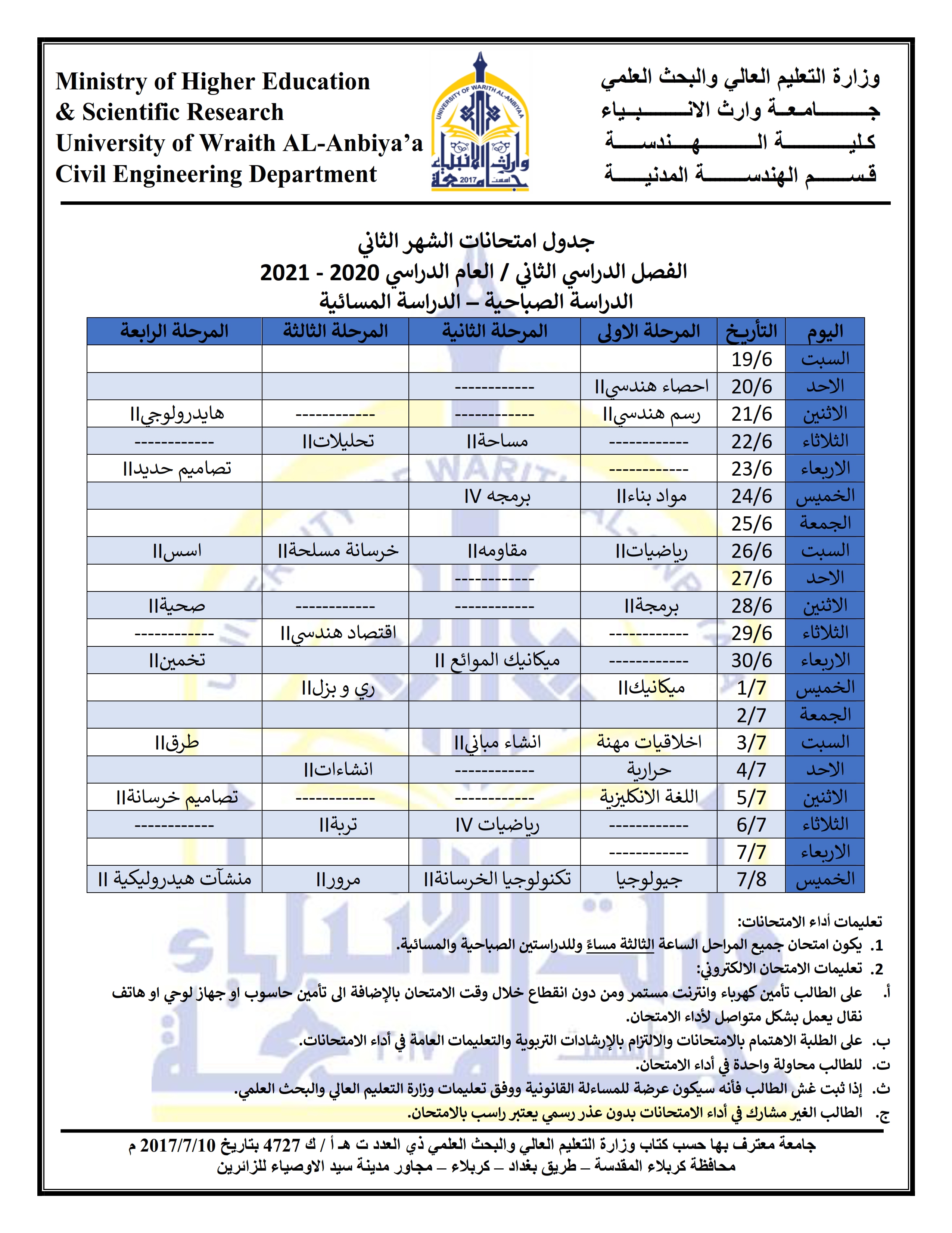 1. يكون امتحان جميع المراحل الساعة الثالثة مساءً وللدراستين الصباحية والمسائية.