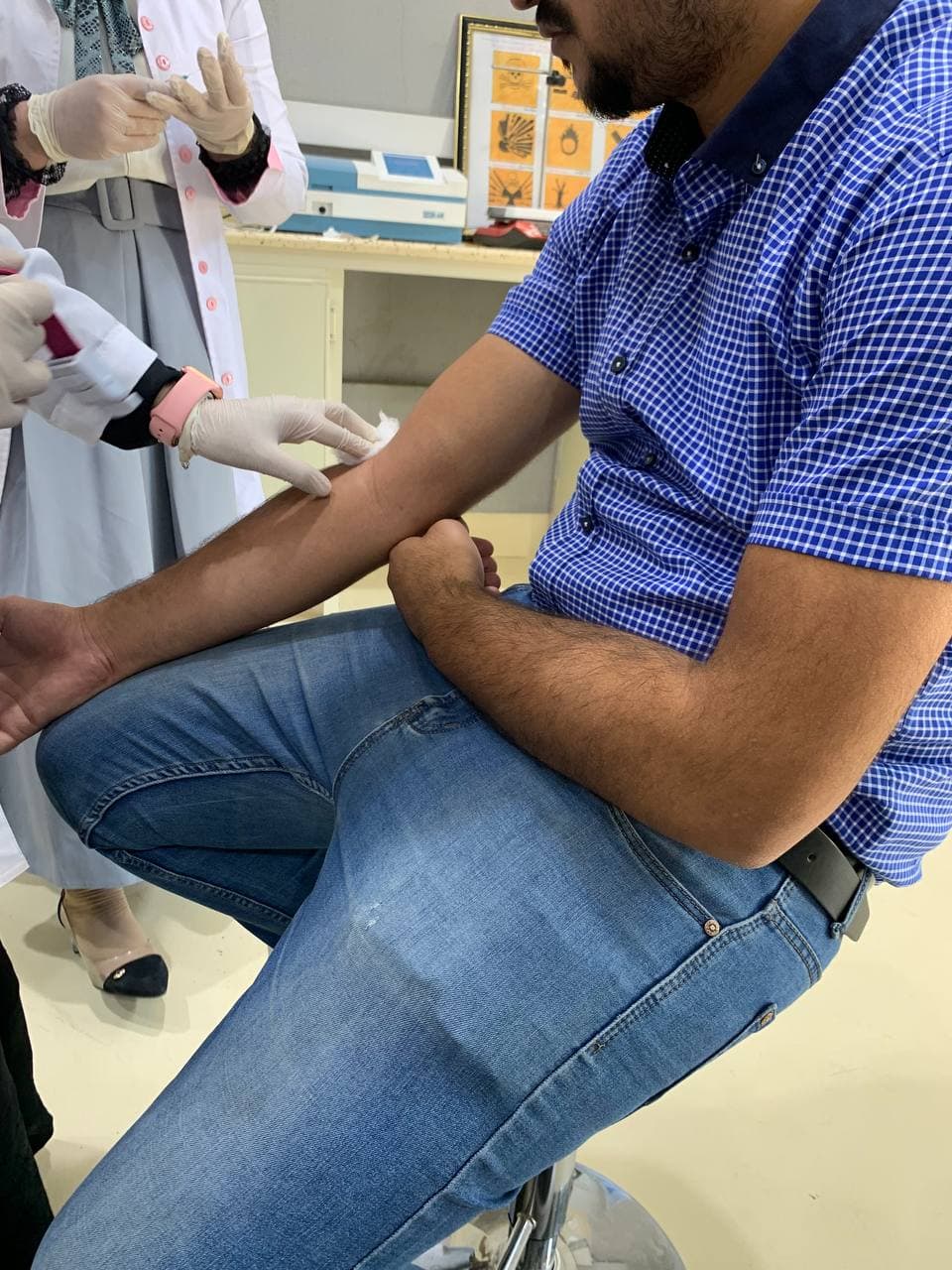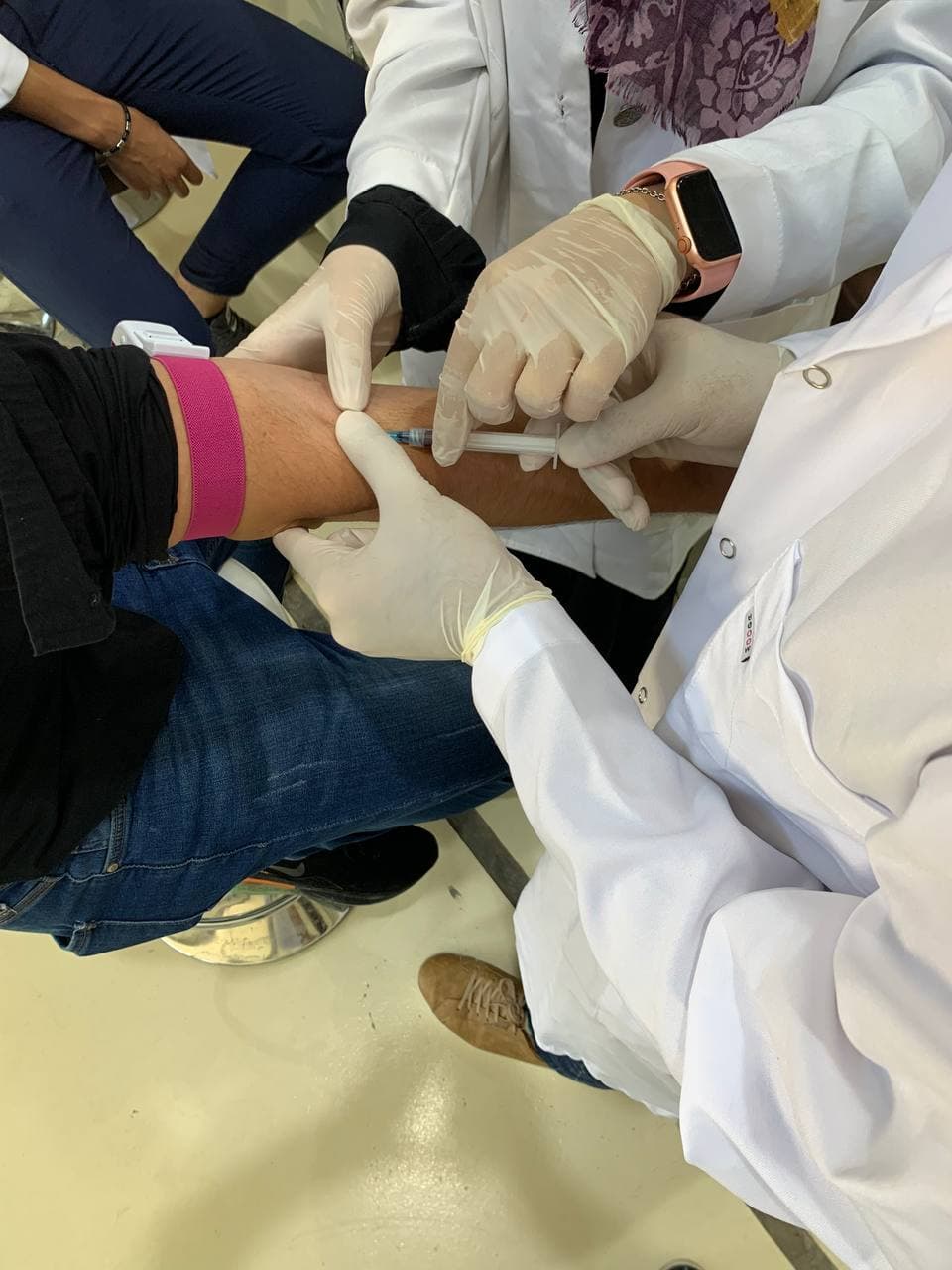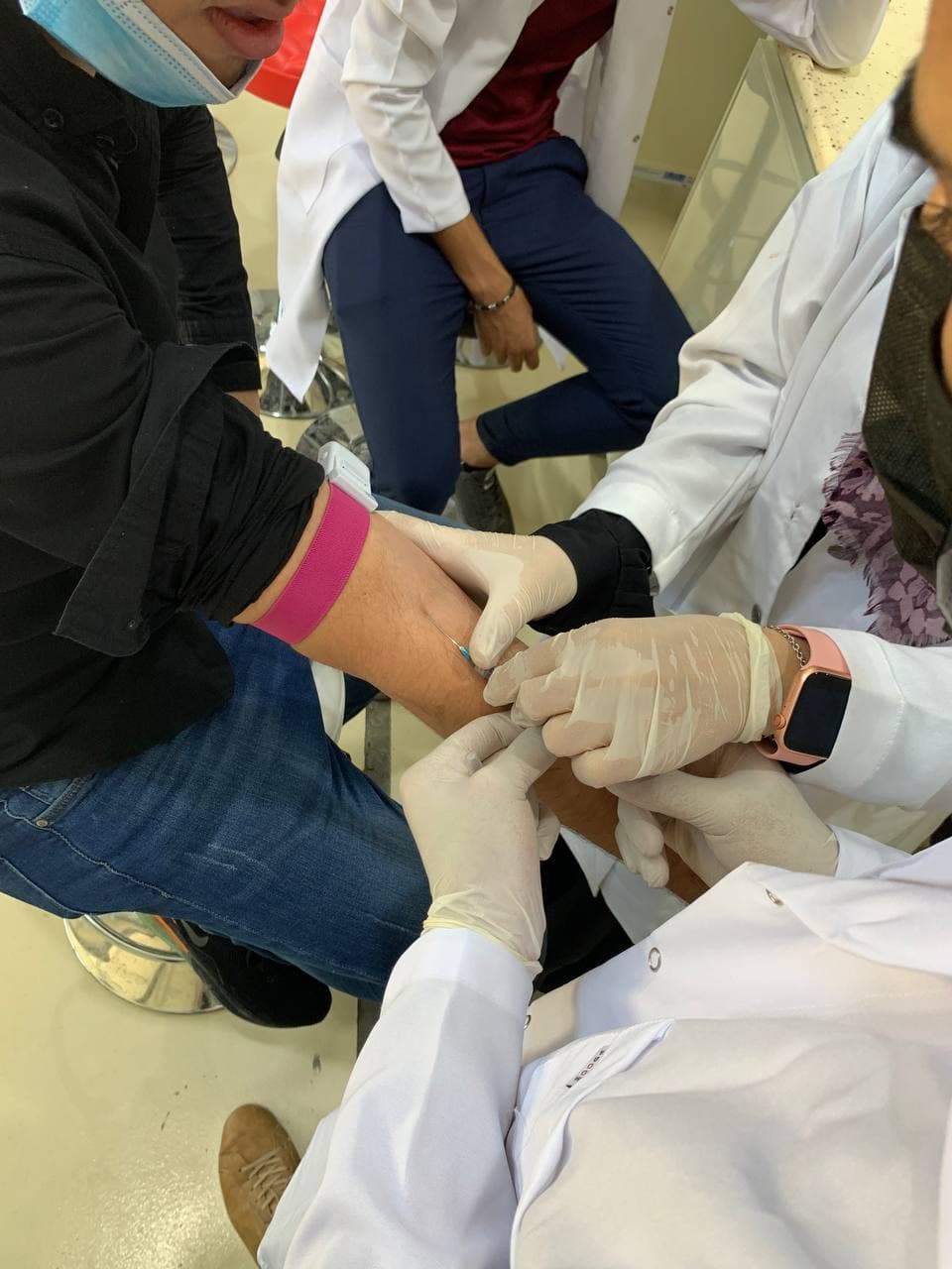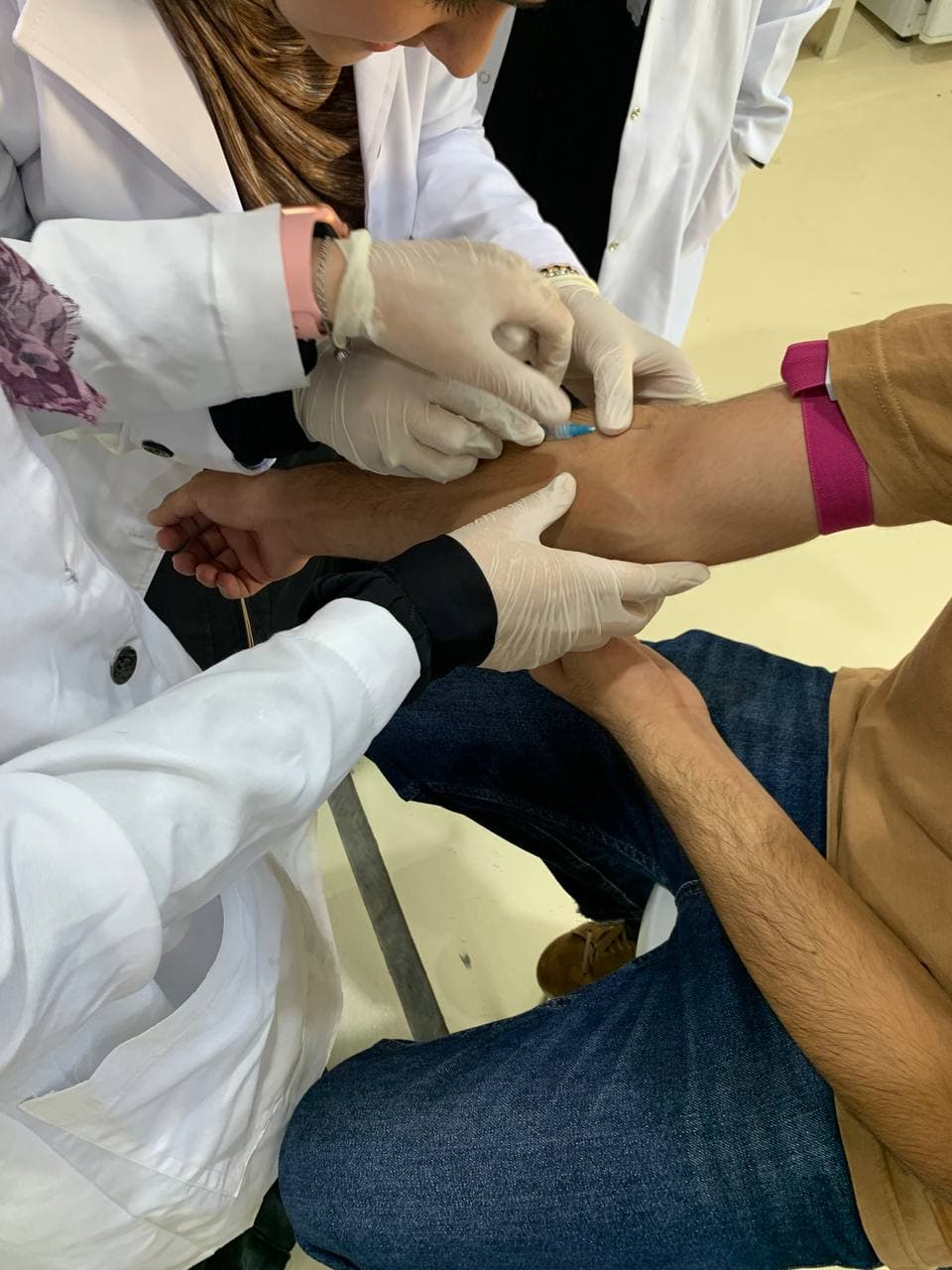 انه في مختبر الكيمياء الحياتية يتعرف الطالب على أجراء بعض الفحوصات المختبرية مثل فحص السكري والدهون واليوريا …… وهذه التجارِب تعتمد على الدَّم ففي بداية كل تجربه نحاول تعريف الطالب على آلية سحب الدم.