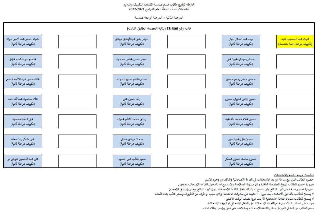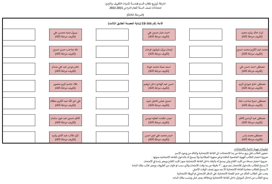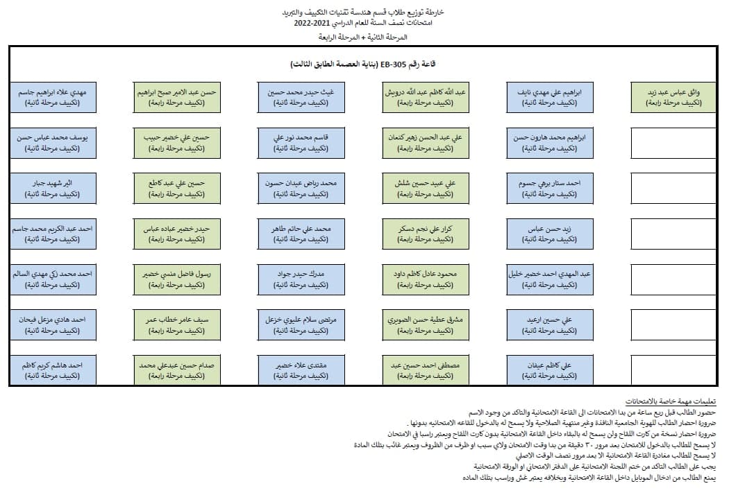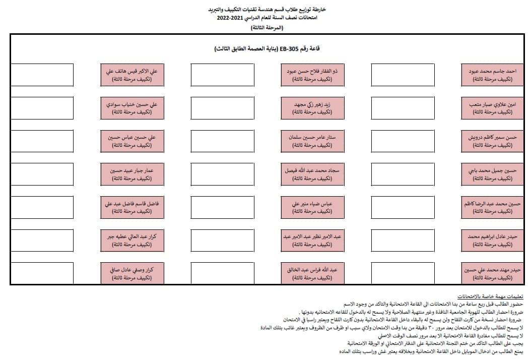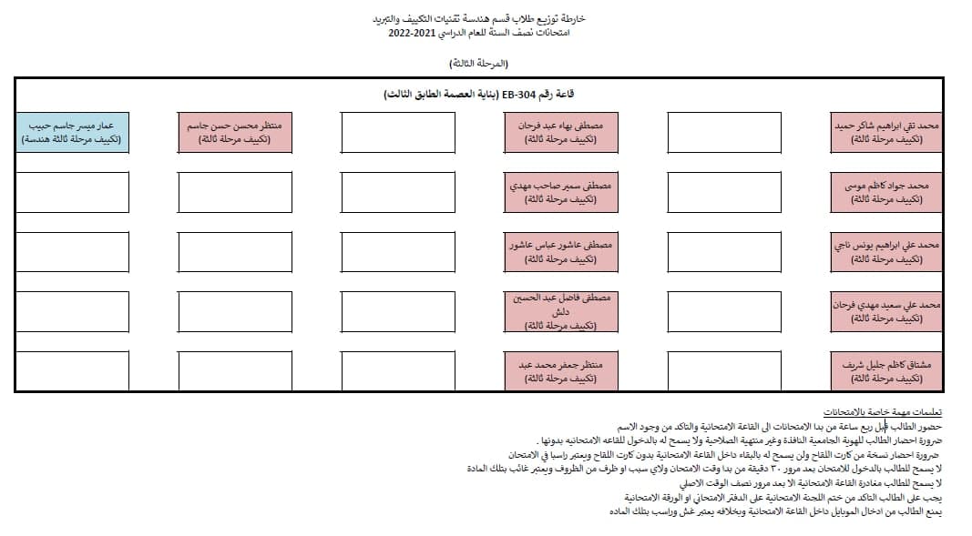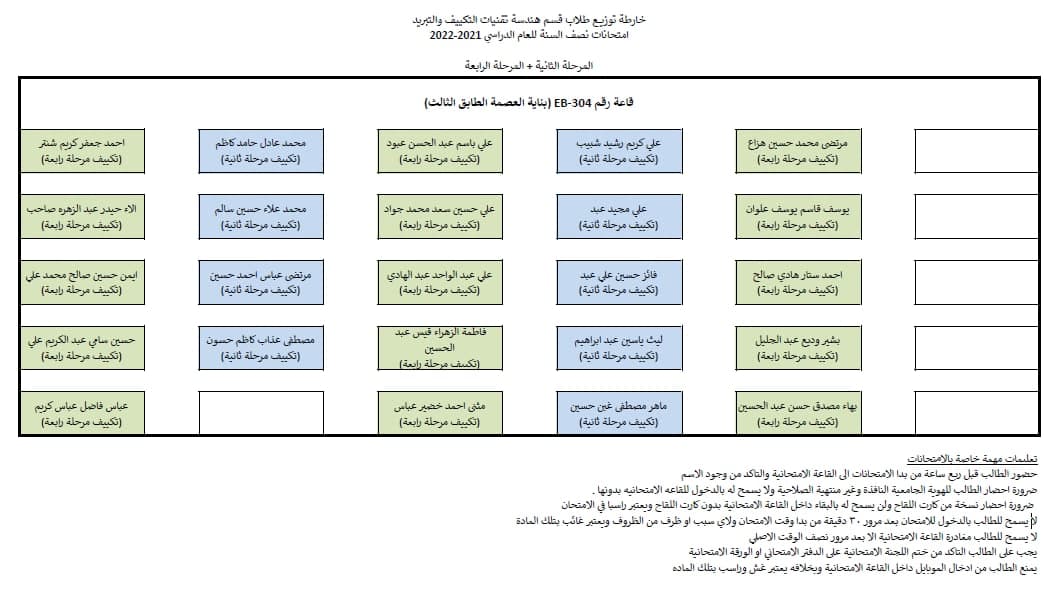 قسم هندسة تقنيات التكييف و التبريد يوضح جدول امتحانات نصف السنة مع خارطة توزيع الطلاب في القاعات الامتحانية