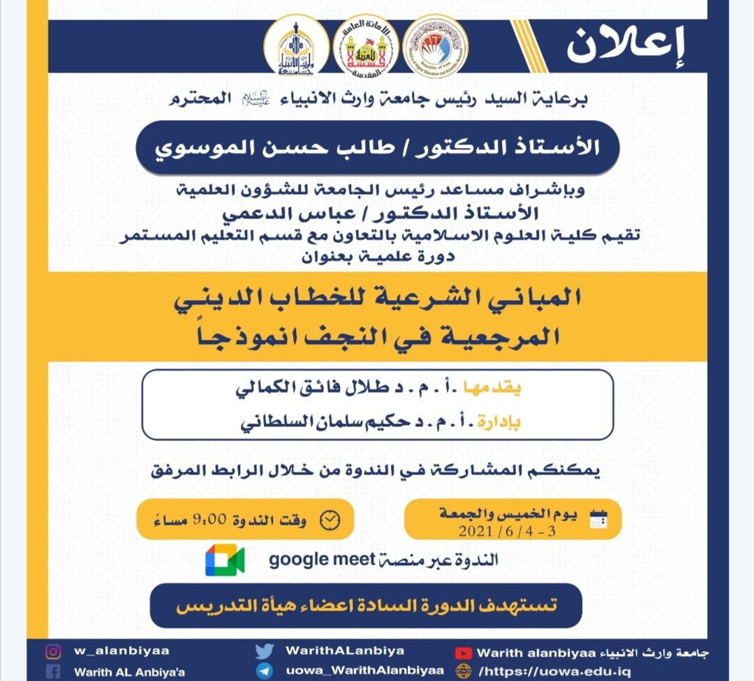 تقيم كلية العلوم الإسلامية بالتعاون مع مركز التعليم المستمر في جامعة وارث الأنبياء دورة علمية بعنوان المباني الشرعية في الخطاب الديني المرجعية الدينية في النجف انموذجا يقدمها ا. م. د طلال فائق الكمالي وبادارة ا. م. د حكيم السلطاني وذلك في يومي الخميس والجمعة الموافق ٣ _ ٤ / ٦ / ٢٠٢١ في تمام الساعة التاسعة مساء عبر منصة التعليم الإلكتروني الكوكل ميت