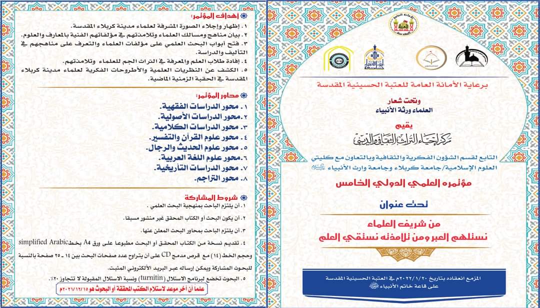 مؤتمر علمي دولي برعاية العتبة الحسينية المقدسة وبالتعاون مع كلية العلوم الاسلامية في جامعة وارث الانبياء