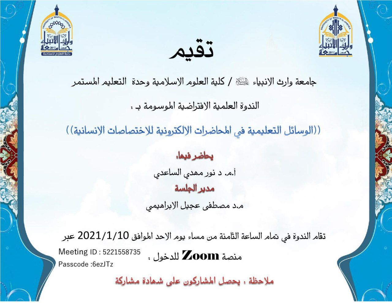 تقيم جامعة وارث الانبياء / كلية العلوم الاسلامية وحدة التعليم المستمرالندوة العلمية الافتراضية الموسومة بـ : ((الوسائل التعليمية في المحاضرات الالكترونية للاختصاصات الانسانية))يحاضر فيها:أ.م. د نور مهدي الساعديمدير الجلسةم.د مصطفى عجيل الابراهيمي