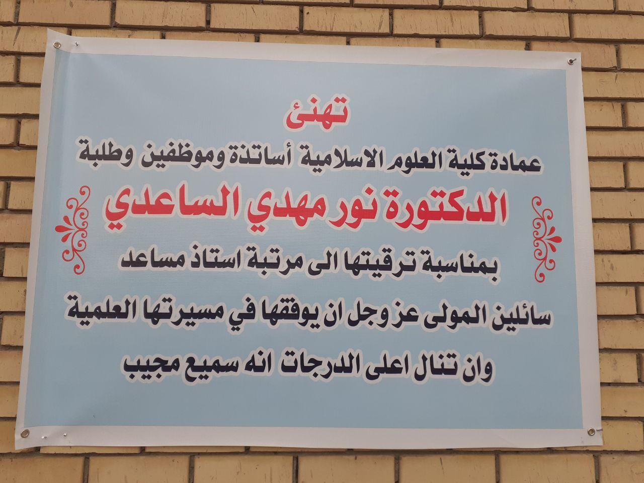 عقدت ندوة علمية بتاريخ 23/2/2020 وبحضور السيد العميد والسادة التدريسيين القتها أ.م.د نور الساعدي والتي اشارت فيها الى الخطوات العلمية والادارية لمعاملات الترقيات العلمية المعمول بها في الجامعلت العراقية .. جاءت هذه الندوة بعد حصول الدكتورة الساعدي على اللقب العلمي وترقيتها الى أ.م.د في نهاية العام الماضي وختمت الندوة بمجموعة من الاسئلة والنقاشات العلمية من قبل السادة التدريسيين بذلك الخصوص .