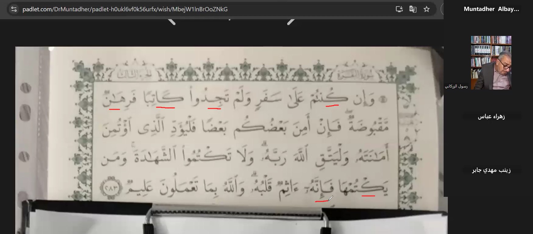 في إطار مشروع كتابة القرآن الكريم "كلمات من النور"، أقامت كلية العلوم الإسلامية في جامعة وارث الأنبياء الورشة الثالثة يوم السبت الموافق 25/1/2025، الساعة العاشرة صباحاً، عبر منصة Zoom، بحضور الخطاط الدكتور رسول الزركاني، رئيس جمعية الخطاطين في بابل.
