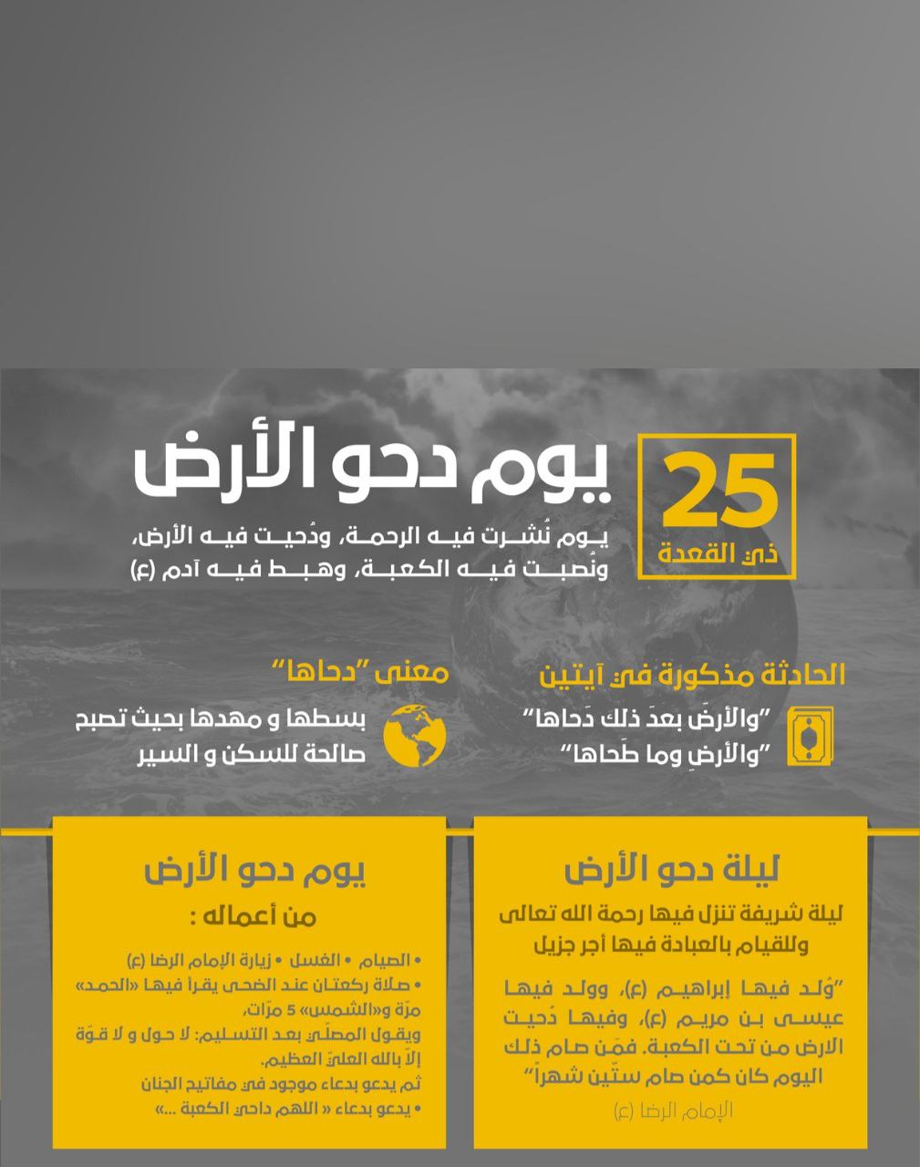 عن أمير المؤمنين علي بن أبي طالب صلوات الله عليه قال: إن أول رحمة نزلت من السماء إلى الأرض في خمس وعشرين من ذي القعدة، فمن صام ذلك اليوم وقام تلك الليلة فله عبادة مائة سنة، صام نهارها وقام ليلها، وأيما جماعة اجتمعت ذلك اليوم في ذكر ربهم عز وجل لم يتفرقوا حتى يعطوا سؤلهم، وينزل في ذلك اليوم ألف ألف رحمة يضع منها تسعة وتسعين في حلق الذاكرين، والصائمين في ذلك اليوم، والقائمين في تلك الليلة.