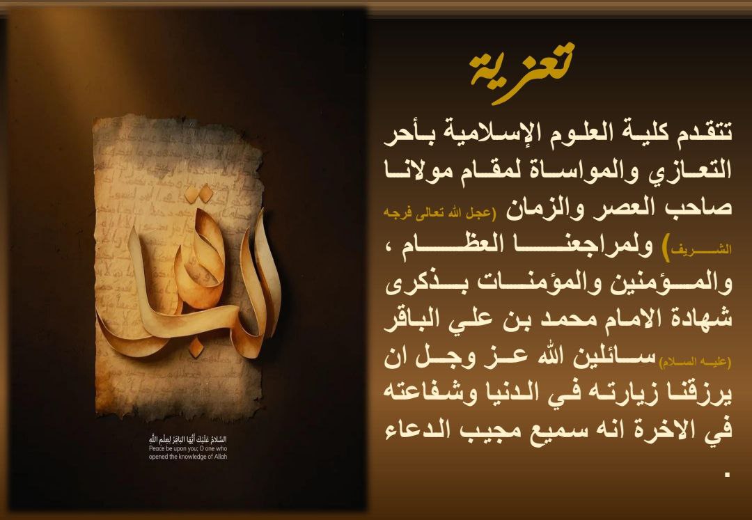 تتقدم كلية العلوم الإسلامية بأحر التعازي والمواساة لمقام مولانا صاحب العصر والزمان (عجل الله تعالى فرجه الشريف) ولمراجعنا العظام ، والمؤمنين والمؤمنات بذكرى شهادة الامام محمد بن علي الباقر (عليه السلام) سائلين الله عز وجل ان يرزقنا زيارته في الدنيا وشفاعته في الاخرة انه سميع مجيب الدعاء