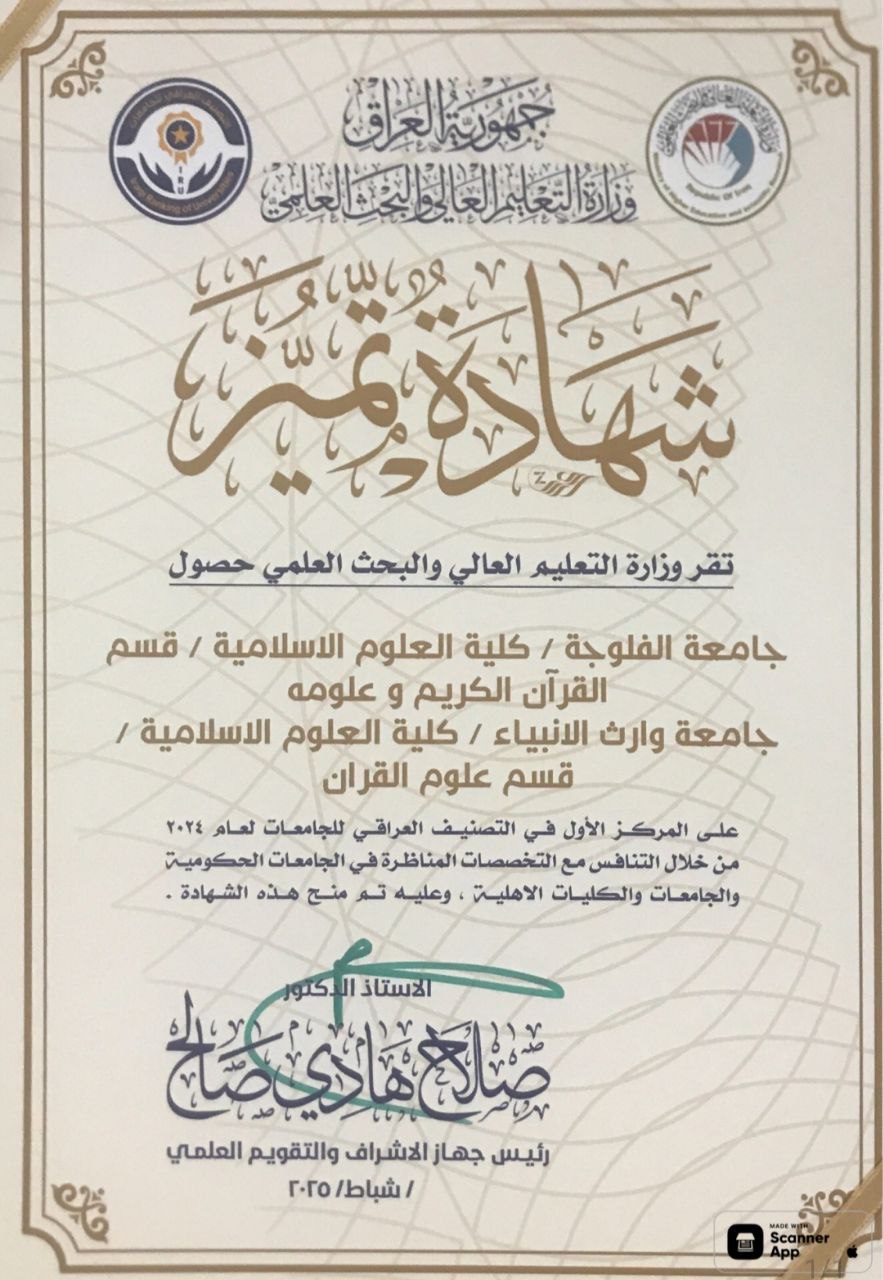 في إنجاز علمي وطني جديد، كرّمت وزارة التعليم العالي والبحث العلمي الدكتور طلال فائق الكمالي، عميد كلية العلوم الإسلامية في جامعة وارث الأنبياء، وذلك بعد أن حققت الكلية - ممثلةً بقسم علوم القرآن - المرتبة الأولى في التصنيف الوطني لكليات العلوم الإسلامية في الجامعات الحكومية والأهلية على مستوى العراق.