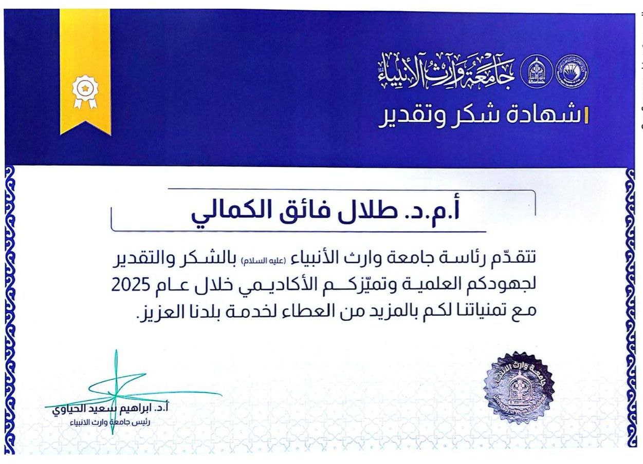 بحضور الأمين العام للعتبة الحسينية المقدسة، تتقدّم رئاسة جامعة وارث الأنبياء (عليه السلام) بخالص الشكر وعظيم التقدير إلى عميد كلية العلوم الإسلامية الأستاذ المساعد الدكتور طلال فائق الكمالي ؛ تثمينًا لجهوده العلمية والأكاديمية المتميزة التي قدّمها خلال عام 2025، وما أسهم به من عطاءٍ فاعل في تطوير الأداء الأكاديمي والارتقاء بالمستوى العلمي للكلية.