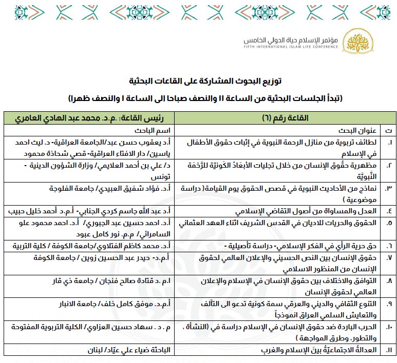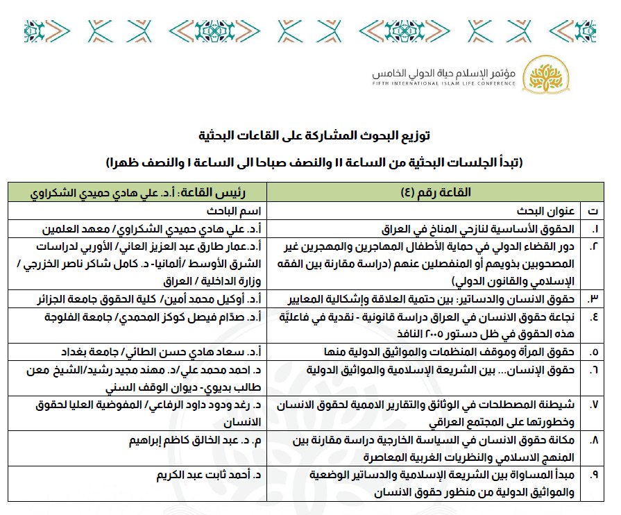 أقيم المؤتمر العلمي الخامس "الإسلام حياة" تحت شعار "حقوق الإنسان والتحديات المعاصرة" بمشاركة واسعة من جامعات العراق والدول العربية والأجنبية. وقالت الدكتورة نور مهدي الساعدي إن المؤتمر شهد تقديم 85 بحثًا من مختلف جامعات العراق، من السليمانية إلى البصرة، وهي سابقة تنفرد بها مؤتمرات كلية العلوم الإسلامية في جامعة وارث الأنبياء.