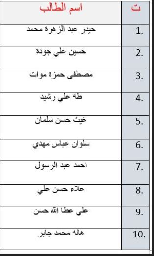 الطلاب العشرة الاوائلنهنأ طلبتنا الاعزاء بهذا التفوق وراجين من الله العزيز الرحيم ان يستمر لمزيد من الابداع لخدمة بلدنا العراق