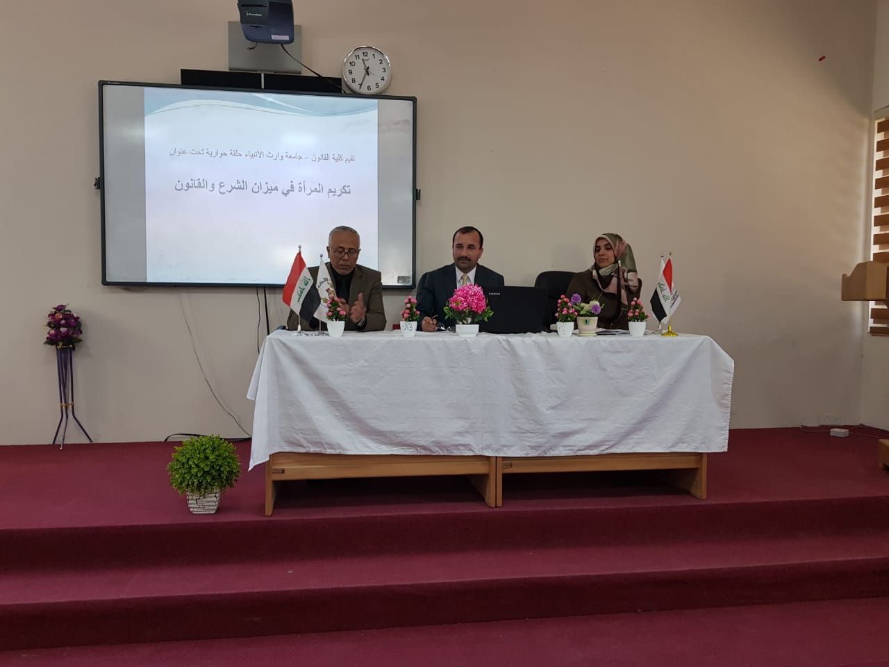بمناسبة يوم المرأة العالمي عقدت كلية  القانون جامعة وارث الانبياء(ع)ورشة عمل تخص مكانةالمرأة في الشر يعٌة الاسلامية  والقانون الوضعي والمعاهدات الدولية وقدم اوراق العمل الاساتذةالمدرجة اسمائهم ادناه:-1 أ.م.د عدنان هاشم جواد / عميد كلية القانون-2 م.دلطيف نجاح شهيد-3 م.م ايلاف فاخر كاظموخرجت الورشة بالتوصيات الاتية:--1 اعادة النظر بالتشر يعٌات النافذة وتعد يلٌ ما امكن من التشر يعٌات بغيةٌ اعطاء المرأةالمز يدٌ من الحقوق التي تضمن كرامتها .-2 توسيعٌ دائرة الضمانات القانونيةمن أجل توسيع مشاركة المرأة في التعليم -3 تفعيل الاجراءات القانونيةضد الاعراف العشائر يةٌ التي تطال حقوق المرأة