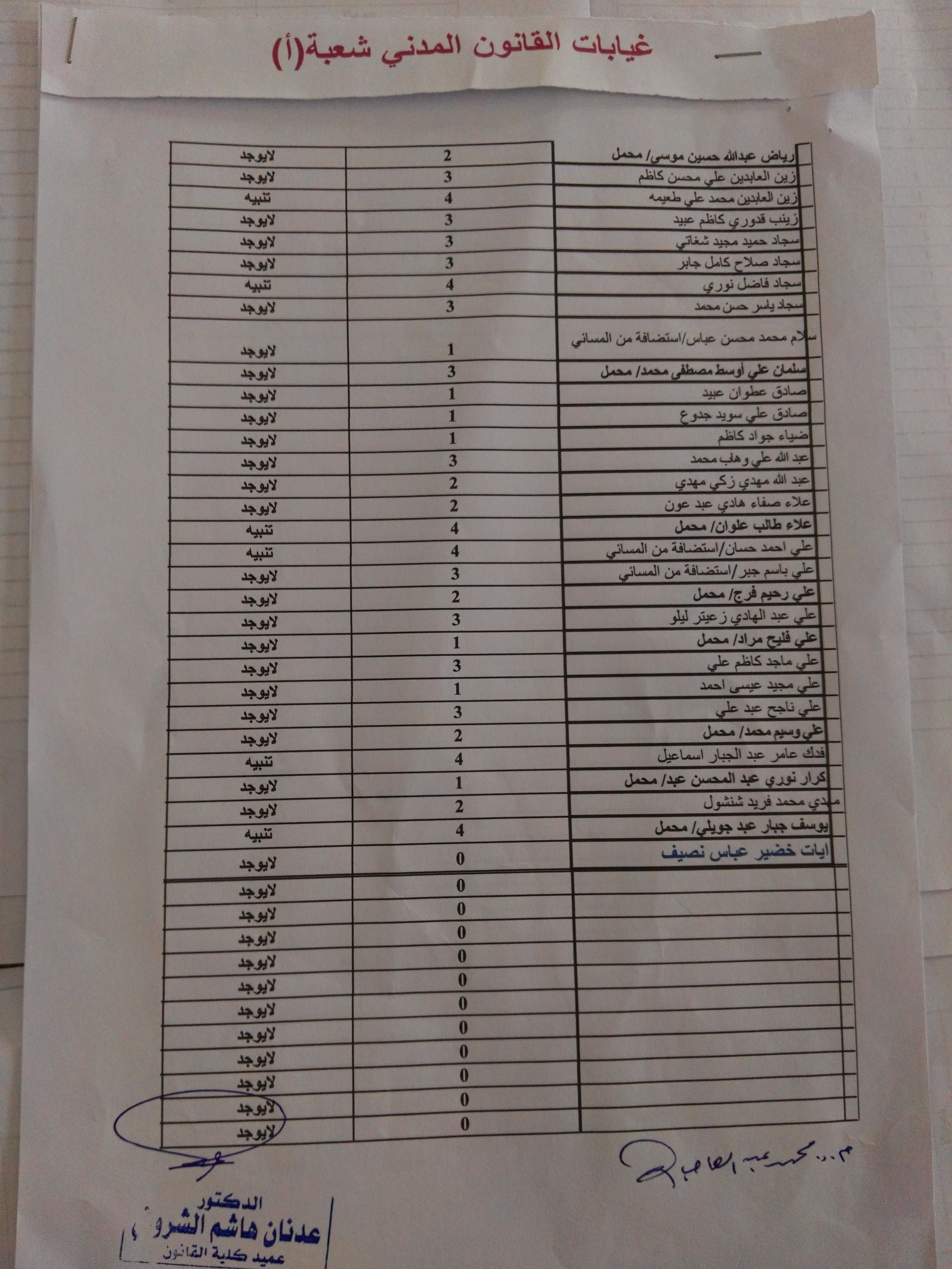بعد التدقيق نتائج الاعتراضات على نتائج الدور الثاني تبين بانها مطابقة للنتائج المعلنة باستثناء الطالب (عبدالله احمد مطشر) اذ منح قرار في ماده المدخل لدراسة القانون فتغيرت حالتة الى النجاح مع بقاء حالتة النهائية راسب في مادة علم الاجرام والعقاب ومادة اللغة الانكليزية