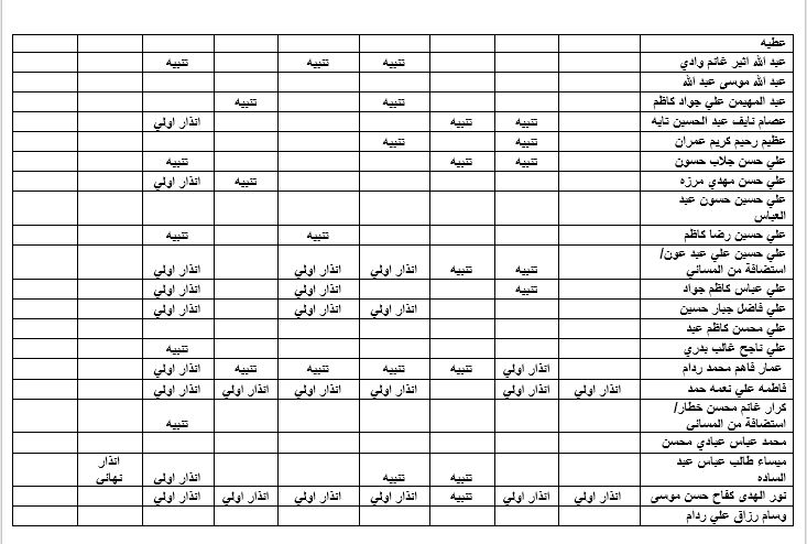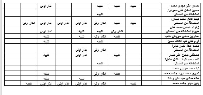 على كافة الطلبة الذين لم يؤدوا امتحان الدور (الاول أو الثاني أو لكليهما لمادة دراسية أو اكثر )التهيؤ لامتحان دور ثالث والذي سيبدأ بعد عطلة زيارة الأربعين وفق الجدول الذي سيعلن لاحقاَ.